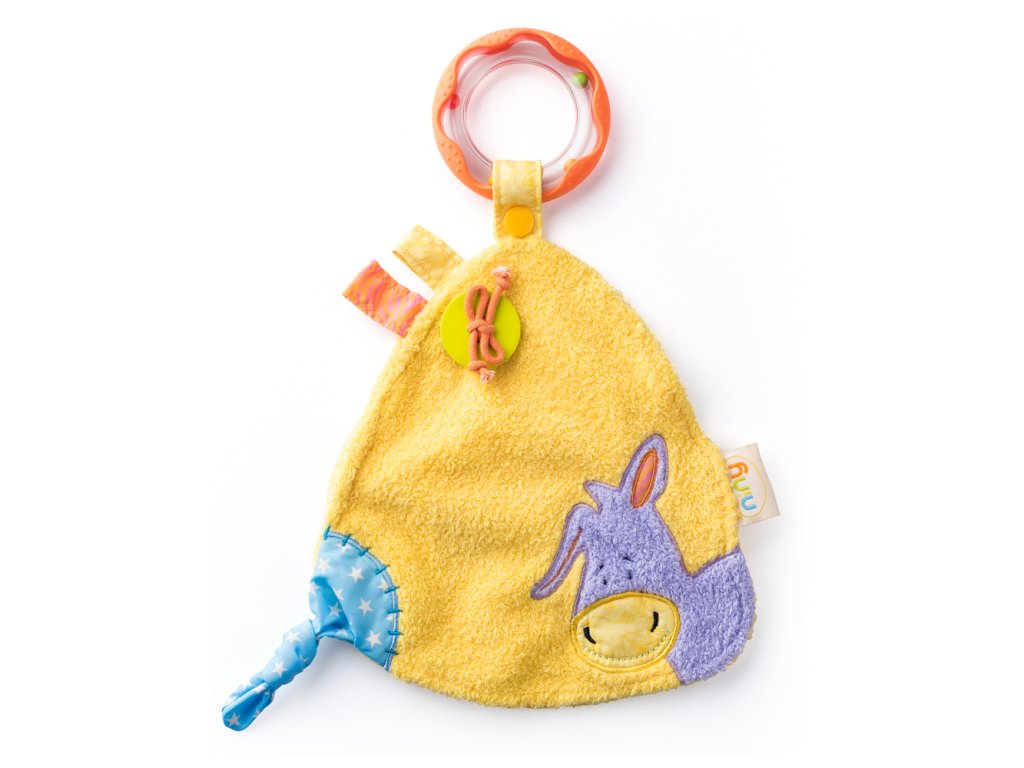 Mazlík muchláček oslík LAKI pomůže vašemu miminku s usínáním i uklidněním během dne. Je příjemný na omak a zaujme svojí barvou a hebkostí. Je měkoučký a miminko se do něj může příjemně zamuchlat. Obsahuje i další stimulační prvky: uzlík, který může okusovat a žmoulat, knoflík s provázkem, který může prozkoumávat a chrastítko s kousátkem na zoubky. Mazlík se postupně stane nerozlučným kamarádem vašeho miminka, který mu pomůže uklidnit se, ukonejšit a usnout. Věk: 0+ | Rozměr: 21 cm