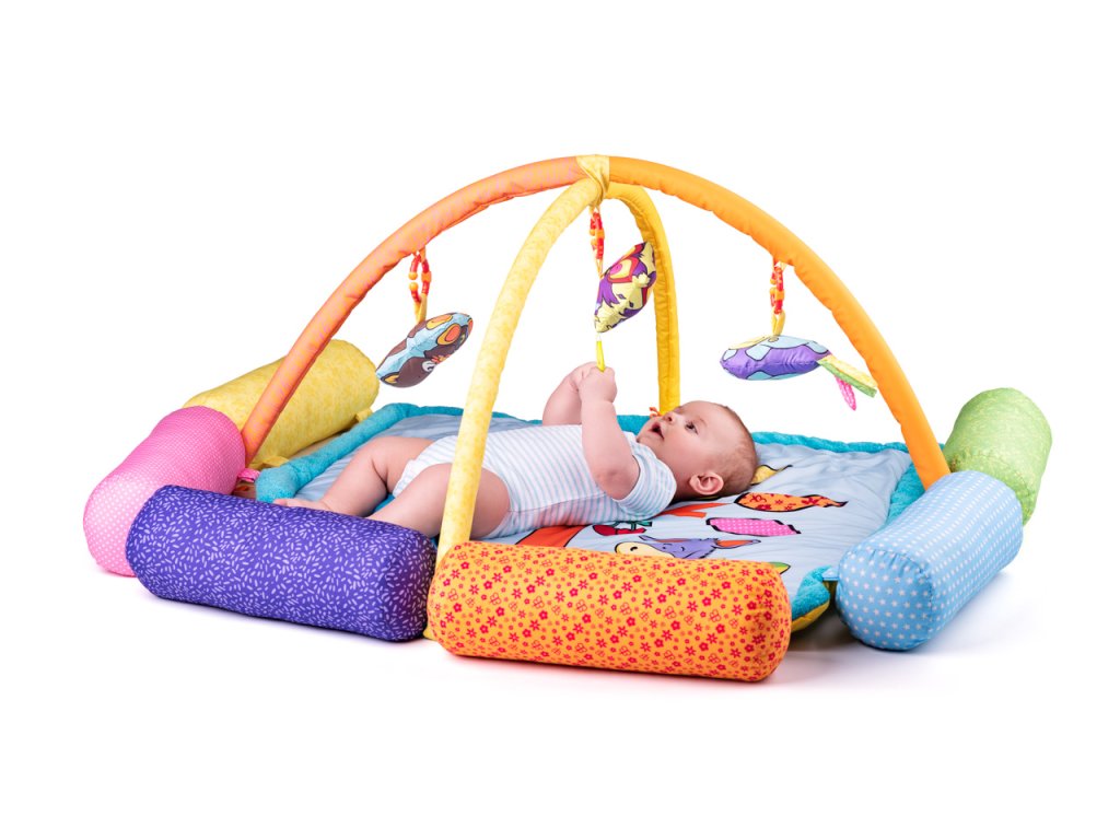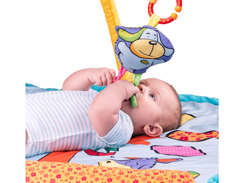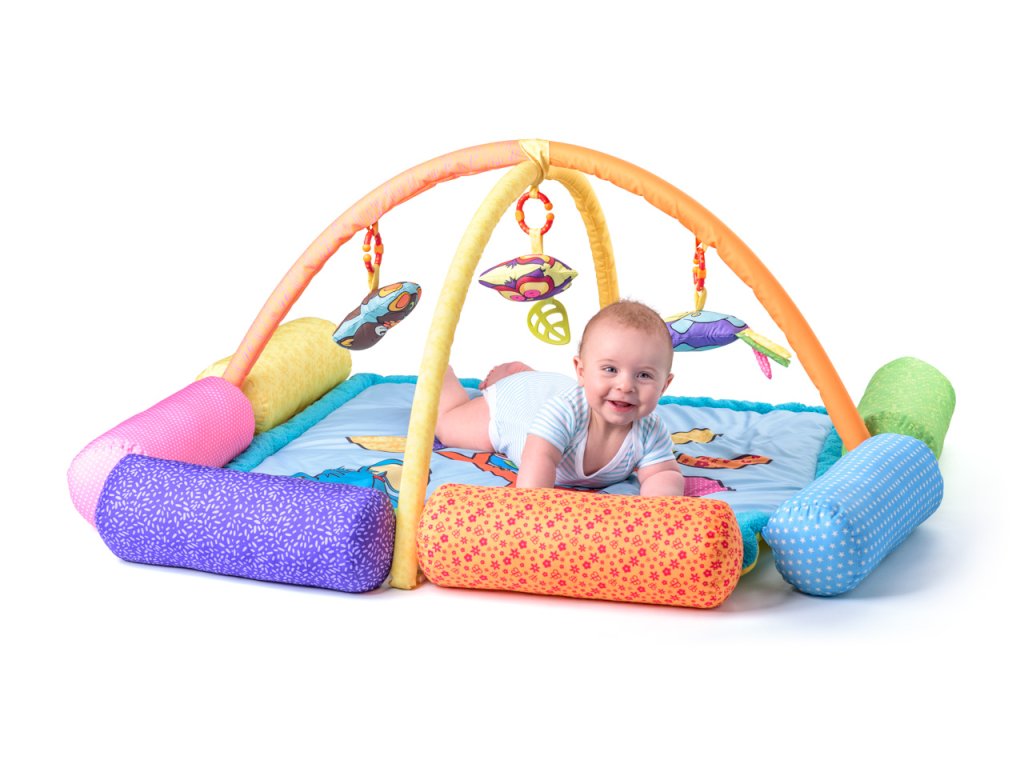 Hrací aréna je vybavena odepínacími polštářky ve tvaru válečků. Tyto polštářky lze odepnout a využívat samotnou deku. Na hrazdě nad arénou jsou zavěšena zvířátka, které mohou děti pozorovat a po kterých se mohou natahovat a posilovat tím své břišní svaly. Tato hrazda je rovněž demontovatelná. Design této arény vytvořila německá návrhářka Britta Hurter. | Věk: 0+ | Rozměr: 96 x 96 cm | Rozměr samotné hrací plochy: 90 x 90 cm