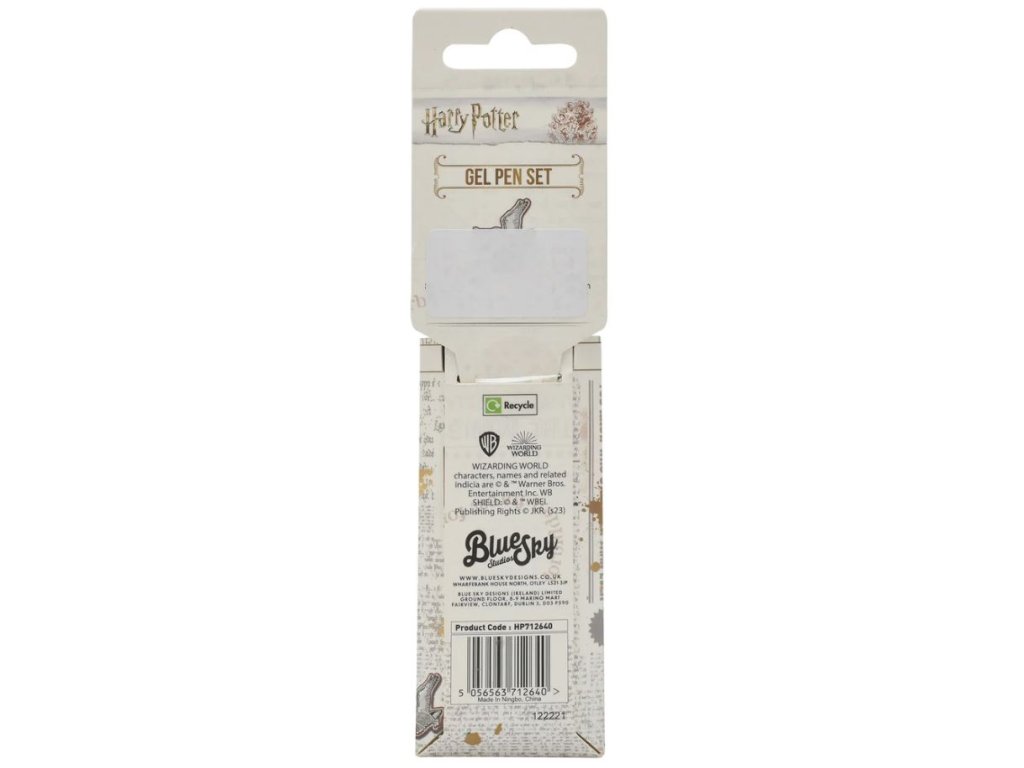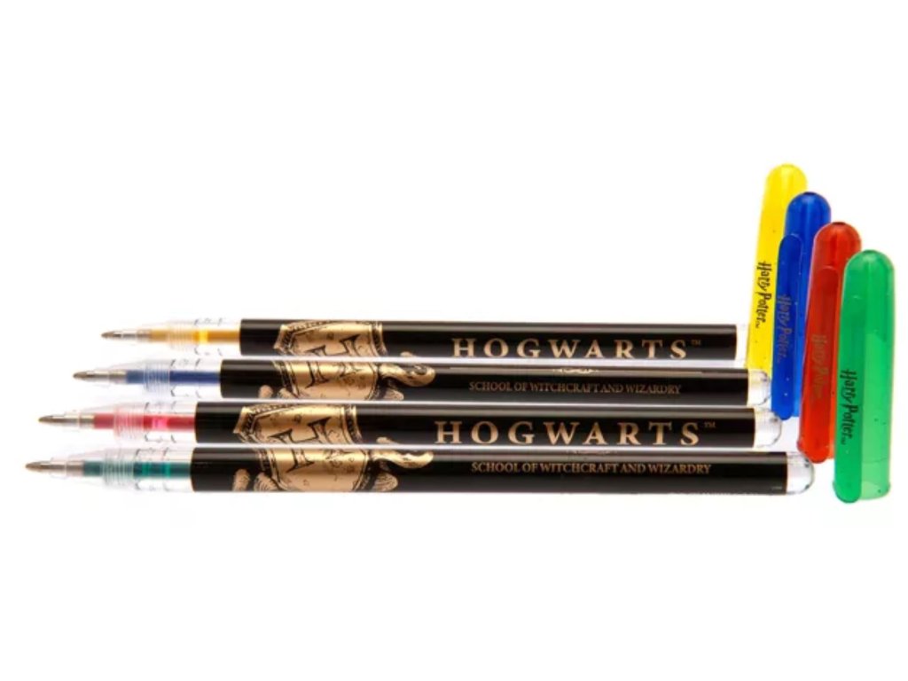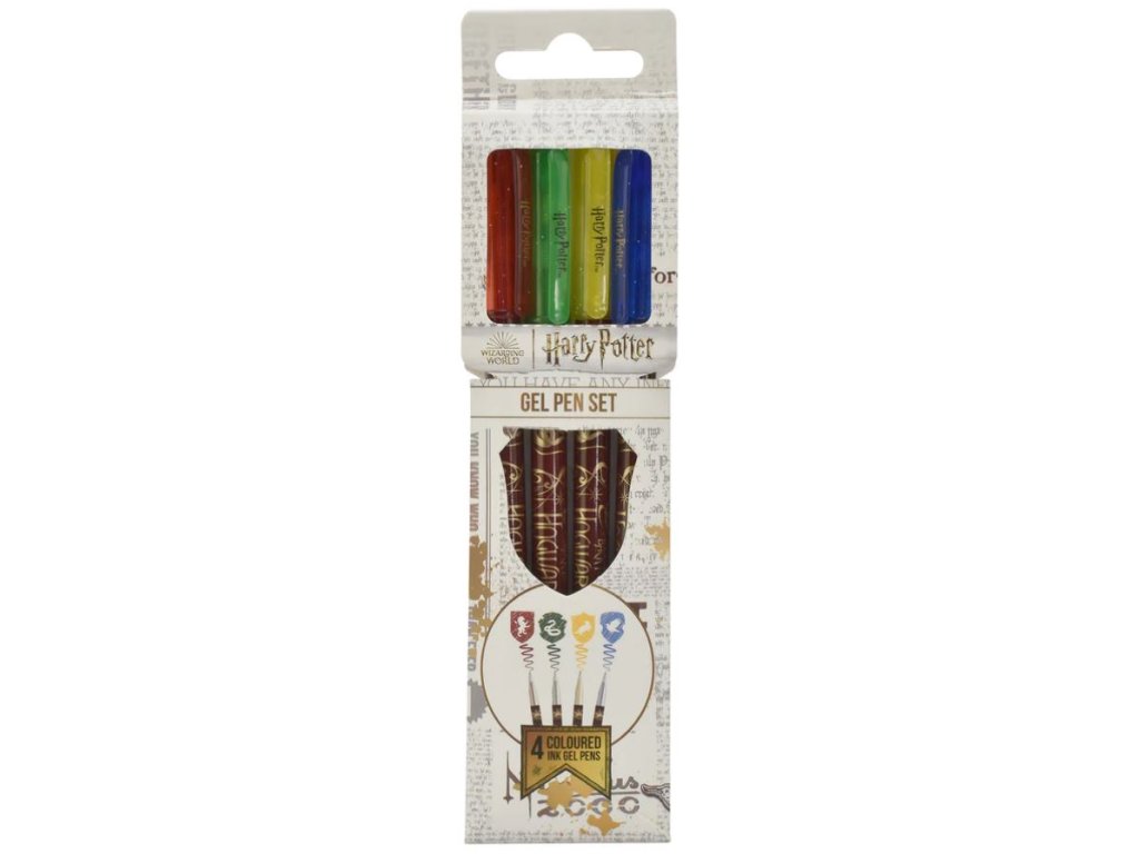 Balení 4 barevných gelových per s grafikou 4 kolejí jménem: Nebelvír, Mrzimor, Havraspár a Zmijozel, nebo pro mudly červené, modré, zelené a žluté gelové pero.