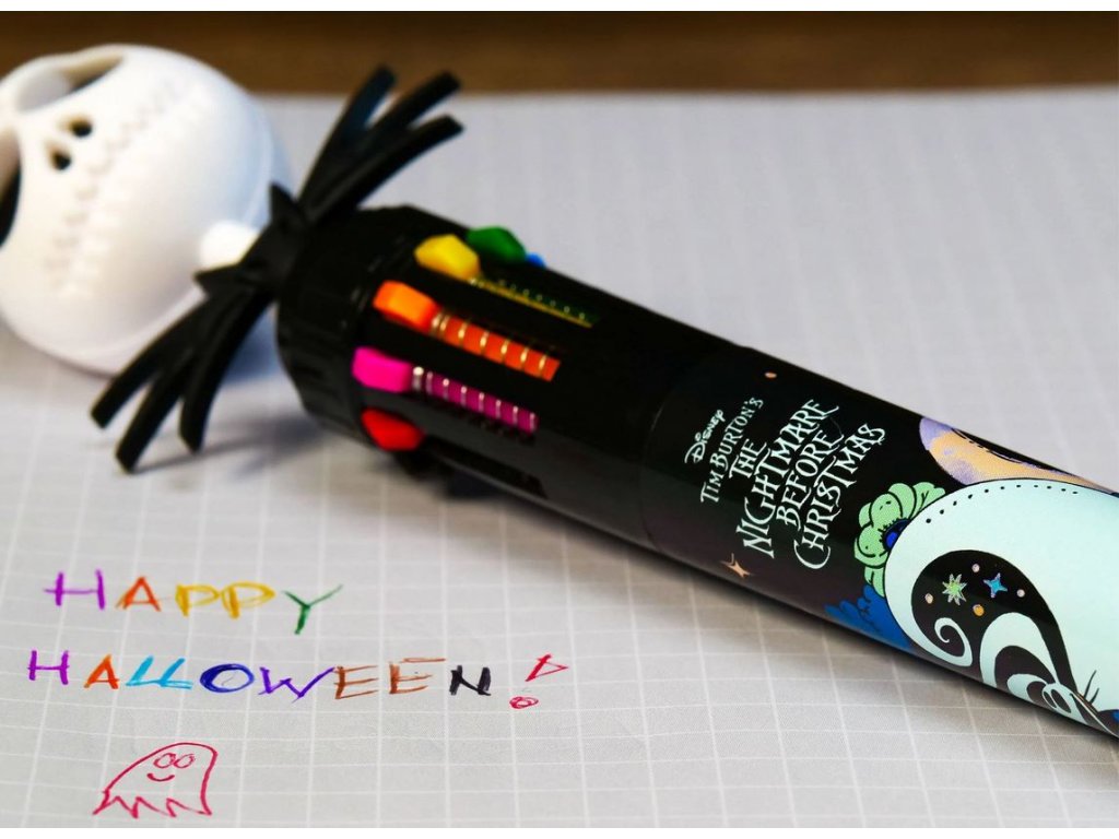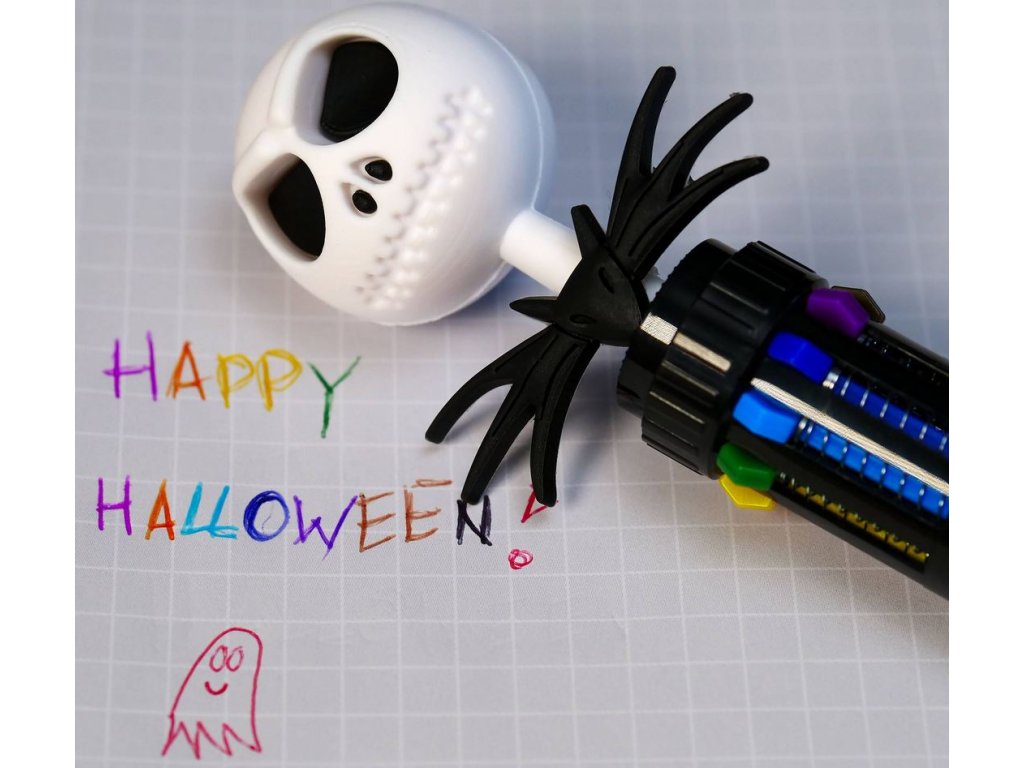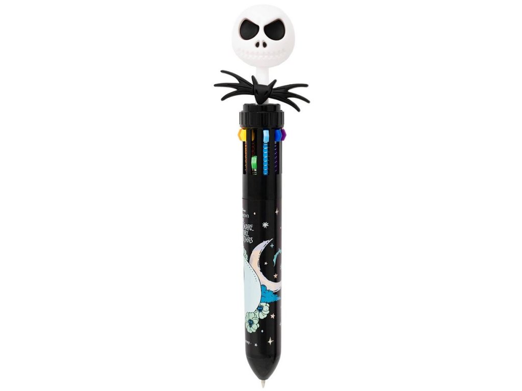 Černá plastová propiska s vícebarevnou tuží inspirována muzikálem Ukradené Vánoce (Jack Skellington). 10 barevné pero s 3D topperem.