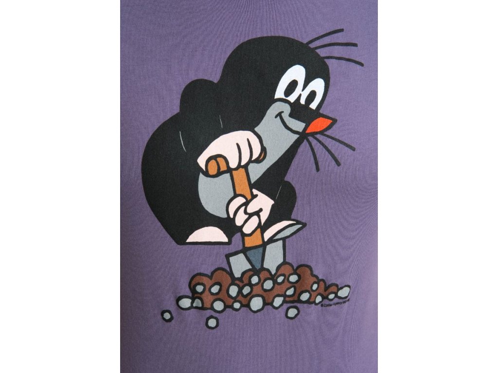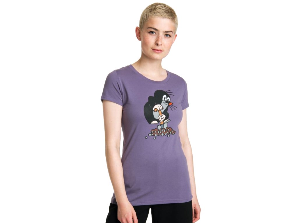 Dámské tričko s krátkým rukávem v levandulové barvě s motivem Krtečka, který kope do země. Přiléhavý střih, příjemný bavlněný materiál, vhodné na volný čas i každodenní nošení.