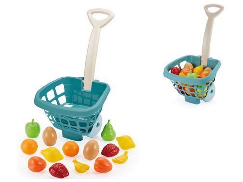 Nakupní košík naplněný různými druhy ovoce a zeleniny. Nákupní košík je díky dvěma kolům a nízké hmotnosti snadno ovladatelný a vhodný pro děti od 18 měsíců. Rozměry produktu 24,5x18,5x41 cm.