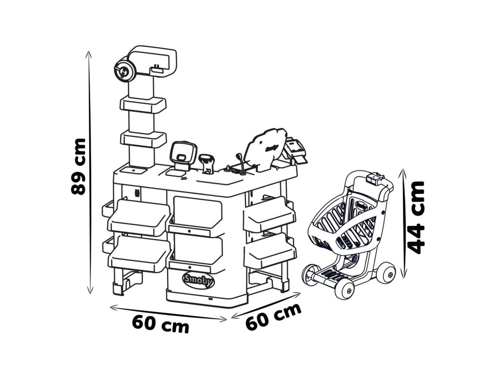 Supermarket s pokladnou, oddělením ovoce /zelenina, váhou (nová mechanická váha: zobrazená hmotnost se upravuje podle vážených potravin). Dítě může nastavovat hodiny a panel otevřeno/zavřeno. Obsahuje 42 doplňků: těstoviny, sušenky, cereálie, mléko, 6 kusů ovoce a zeleniny, 1 koláč, 2 makronky, 2 plechovky, 1 elektronický snímač čárových kódů se zvukem a světlem, 1 kreditní karta, 4 účtenky, 9 mincí a 12 bankovek. Pokladna má zásuvku na peníze, mikrofon a čtečku kreditních karet. Vozík součástí.