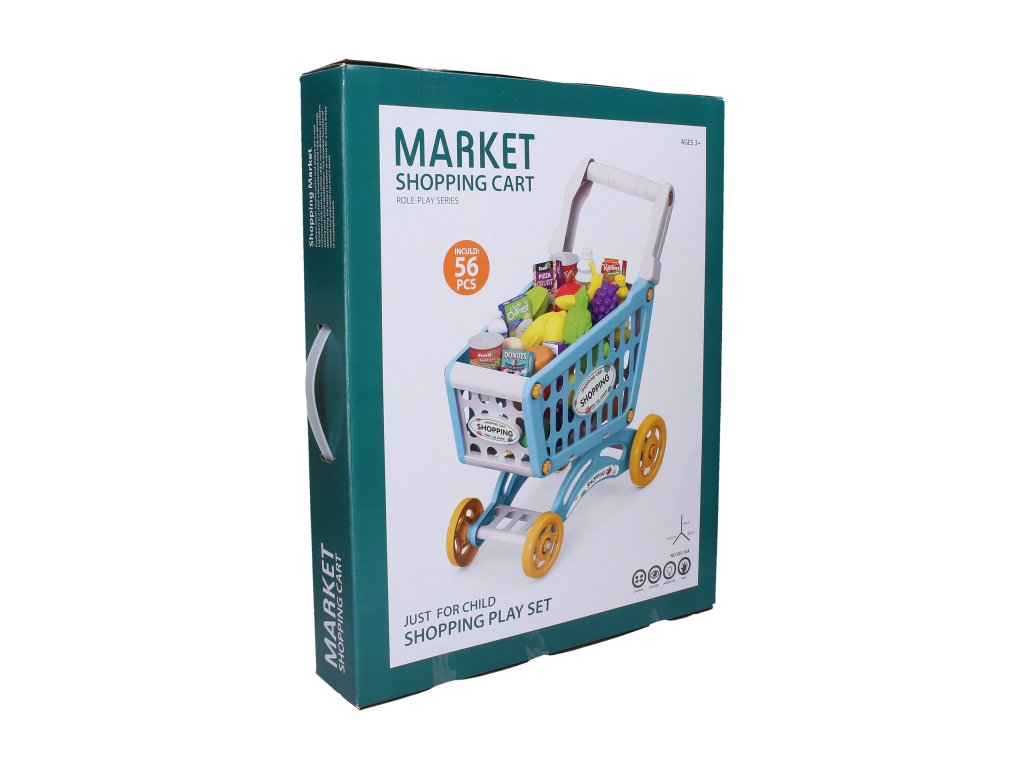 Nákupní vozík s potravinami. Rozměry vozíku 40 x 24,5 x 44 cm. Obrázkový návod na složení se nachází na obalu. Balení obsahuje 56 kusů potravin.