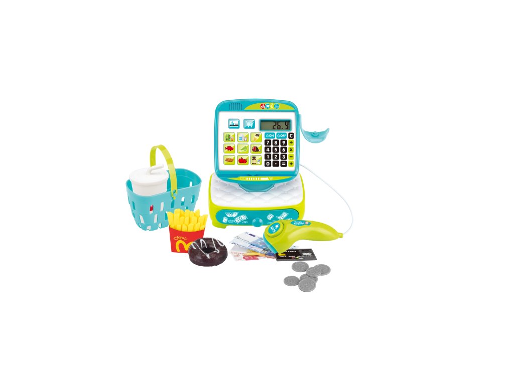 Pokladna. Velikost 22,5x15x22 cm. Obsahuje pokladnu, košík s potravinami, peníze a kreditní kartu. Pokladna funguje jako kalkulačka. Má vysunovací šuplík na peníze. Světlené a zvukové efekty. 2xAA baterie nejsou součástí.