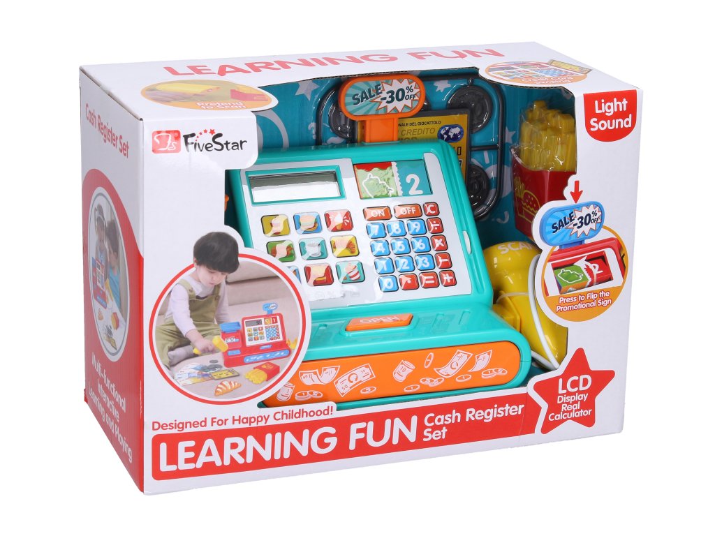 Pokladna. Velikost 26x13x17 cm. Obsahuje pokladnu s výsuvným šuplíkem na mince, displejem a funkční kalkulačkou, potraviny, mince, kreditní kartu. 2xAA baterie nejsou součástí.