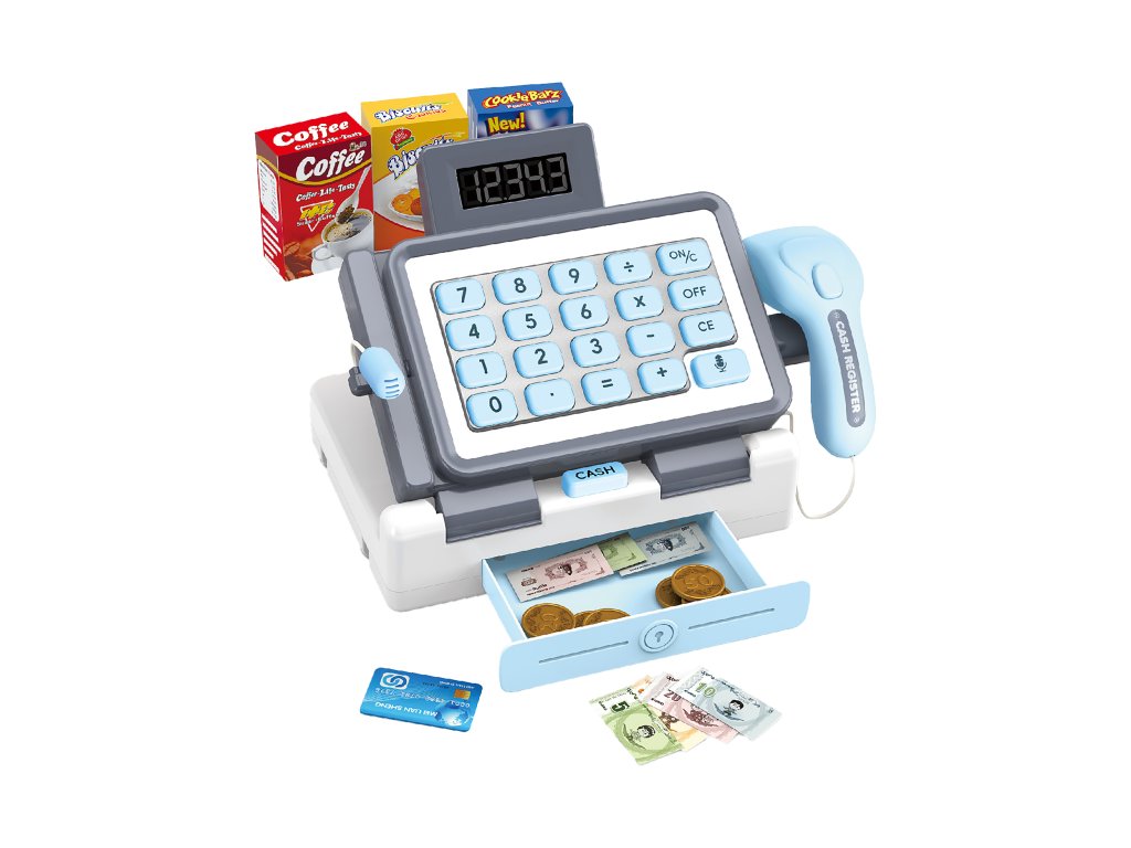 Pokladna s efekty modrá. Velikost 25x15x18.5cm. Funkce kalkulačky, mikrofon, otevírací šuplík na peníze. Baterie 3xAA nejsou součástí.