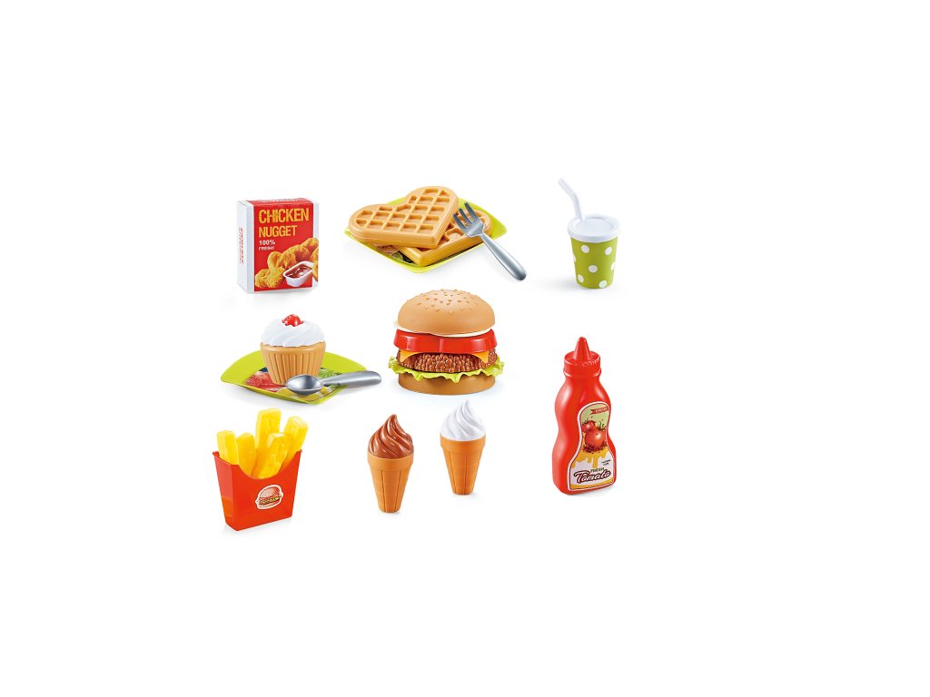 Potraviny set. Obsahuje: hranolky, skládací hamburger, zmrzliny, dortík, vafle, pití, kečup, příbor, talířky.