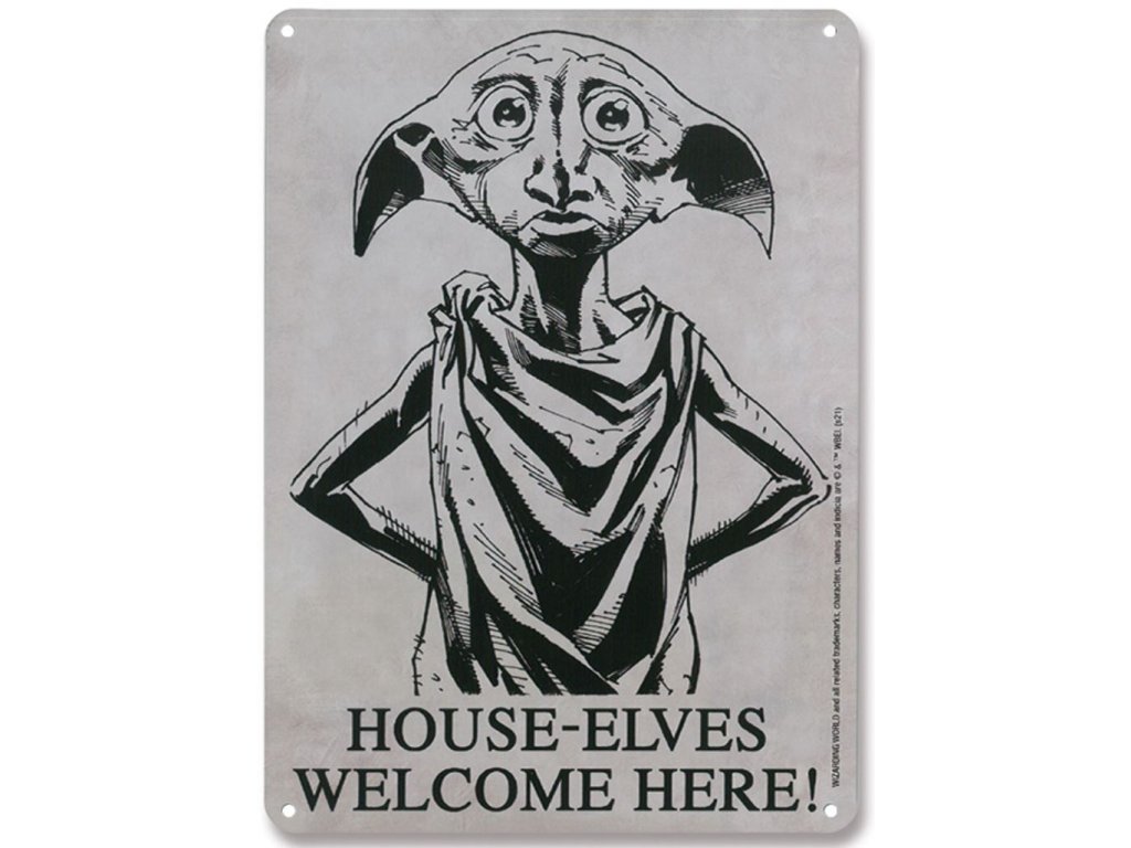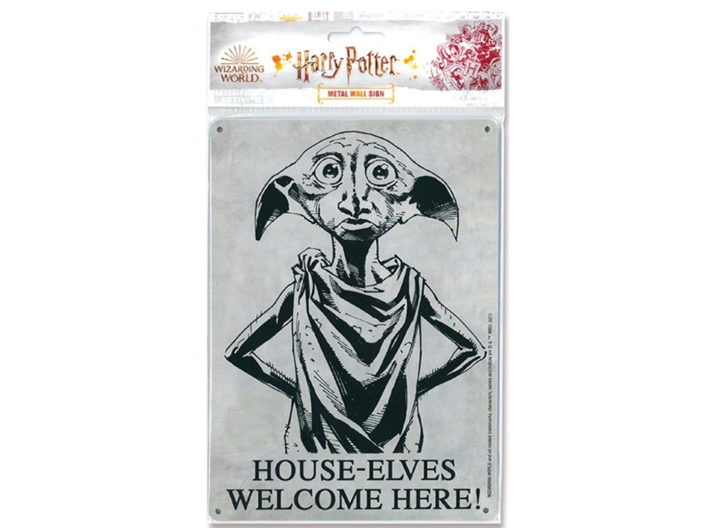 Šedá plechová dekorativní cedule na zeď s grafikou skřítka Dobbyho, postavy z populární kouzelnické ságy Harryho Pottera.
