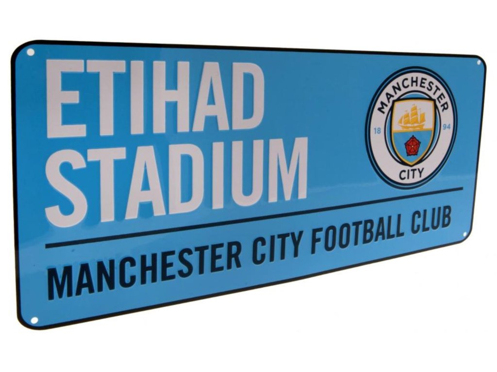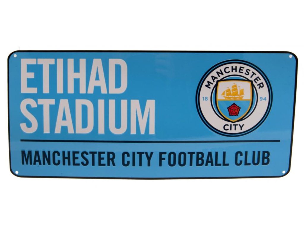 Interiérová modrá dekorace pro každého fanouška slavného fotbalového klubu FC Manchester City. Plechová cedule označující Etihad Stadium. Skvělá možnost, jak ukázat svoji oddanost oblíbenému klubu.