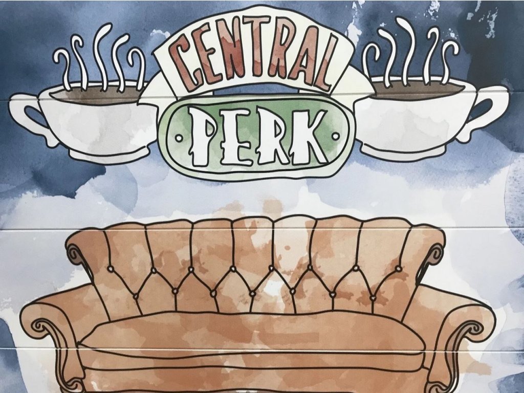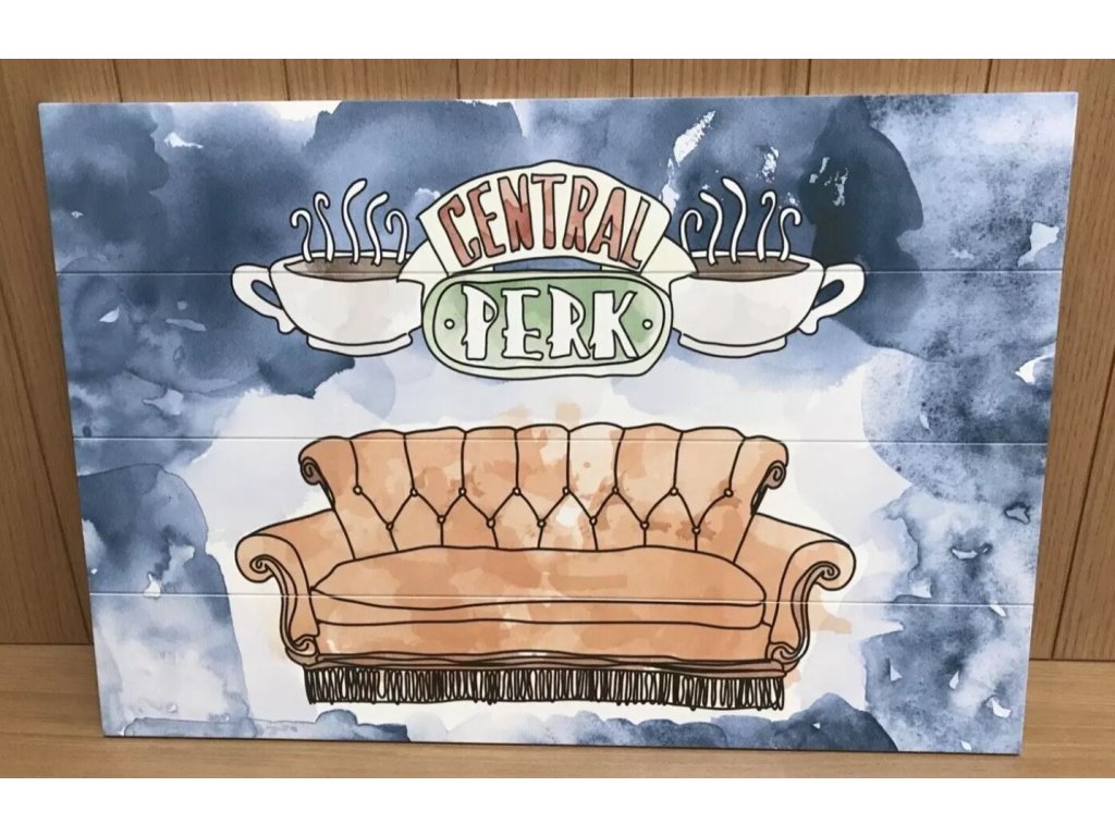 Dřevěný obraz s grafikou, znakem a logem amerického televizního seriálu Friends - Central Perk.