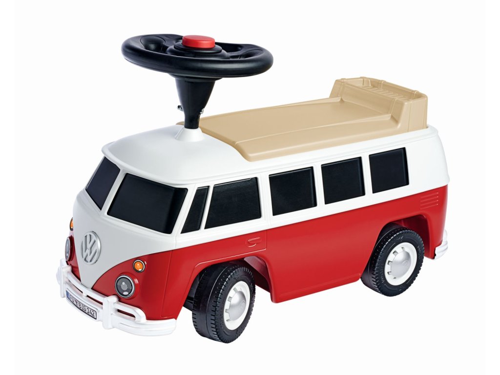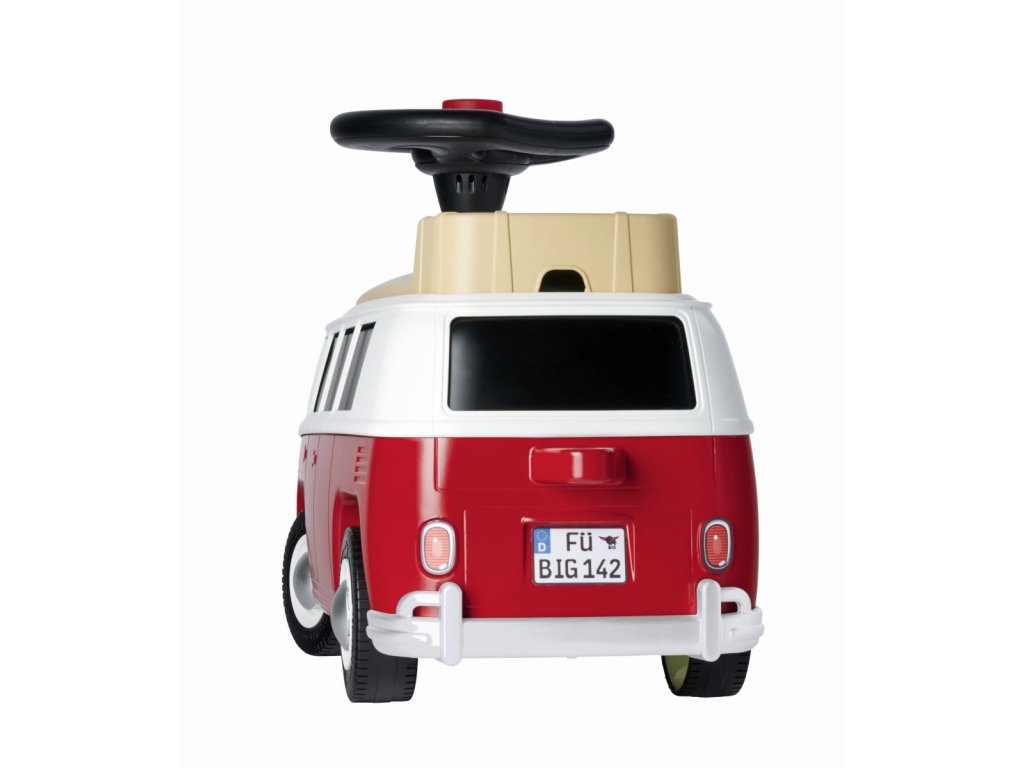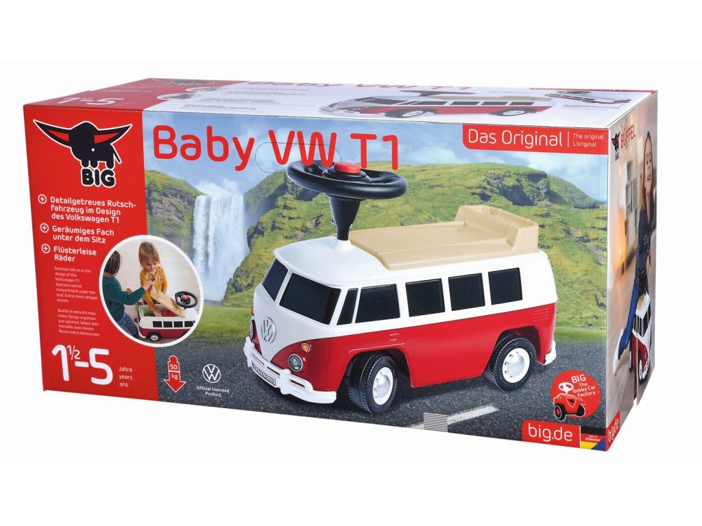 Detailně zpracované odrážedlo v designu Volkswagen T1 s odnímatelným sedadlem, malým opěradlem a zadním tažným zařízením. S Baby VW T1 přidává BIG do svého mezitím diverzifikovaného vozového parku další klasické vozidlo. Jízdní vozidlo bylo v každém detailu vymodelováno podle svého vzoru, Volkswagenu T1, a má řadu funkčních vylepšení. Pod vyjímatelným sedadlem s malým opěradlem se ukrývá prostorná přihrádka, do které lze bezpečně uložit osobní věci řidiče. Kola mají tiché pneumatiky, které nezanechávají stopy a nehrozí tak zanechání otisků na podlaze, a proto je karavan ideální i pro vnitřní použití. Max. nosnost 50 kg. Rozměry: 60,5 x 23 x 37 cm. Váha 3,4 kg. S dvouplášťovým volantem s integrovaným mechanickým klaksonem. Baby VW T1 se vyrábí v moderní továrně BIG v Německu a byl testován na maximální bezpečnost. Oficiálně licencováno Volkswagenem.