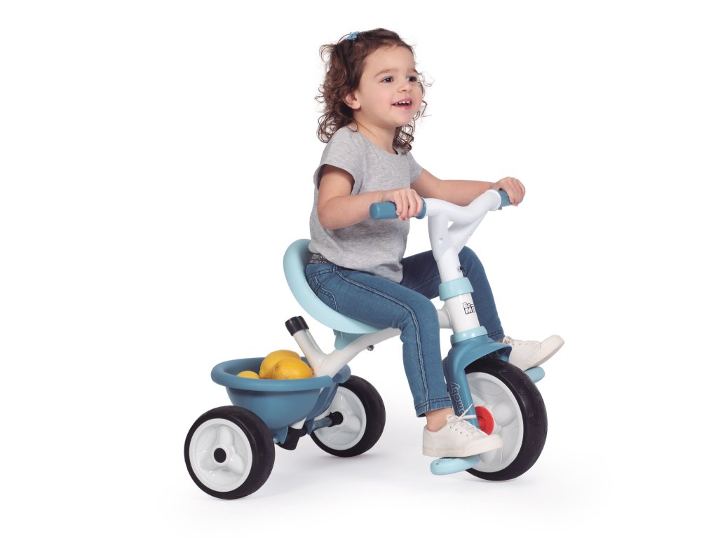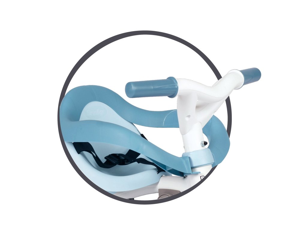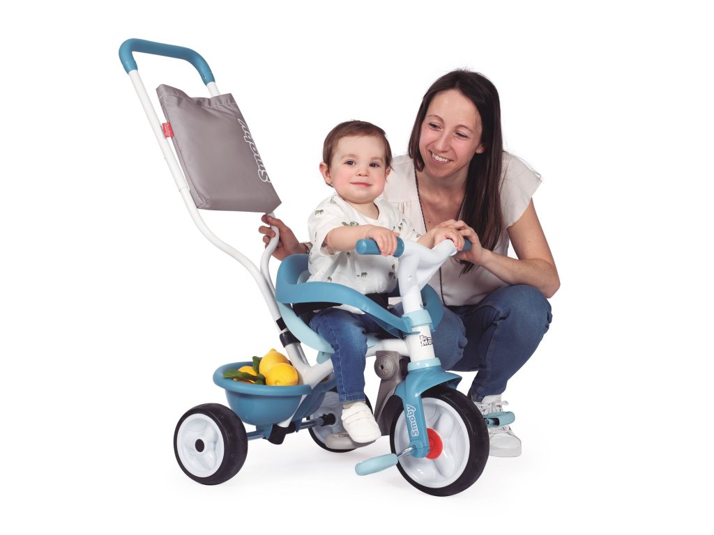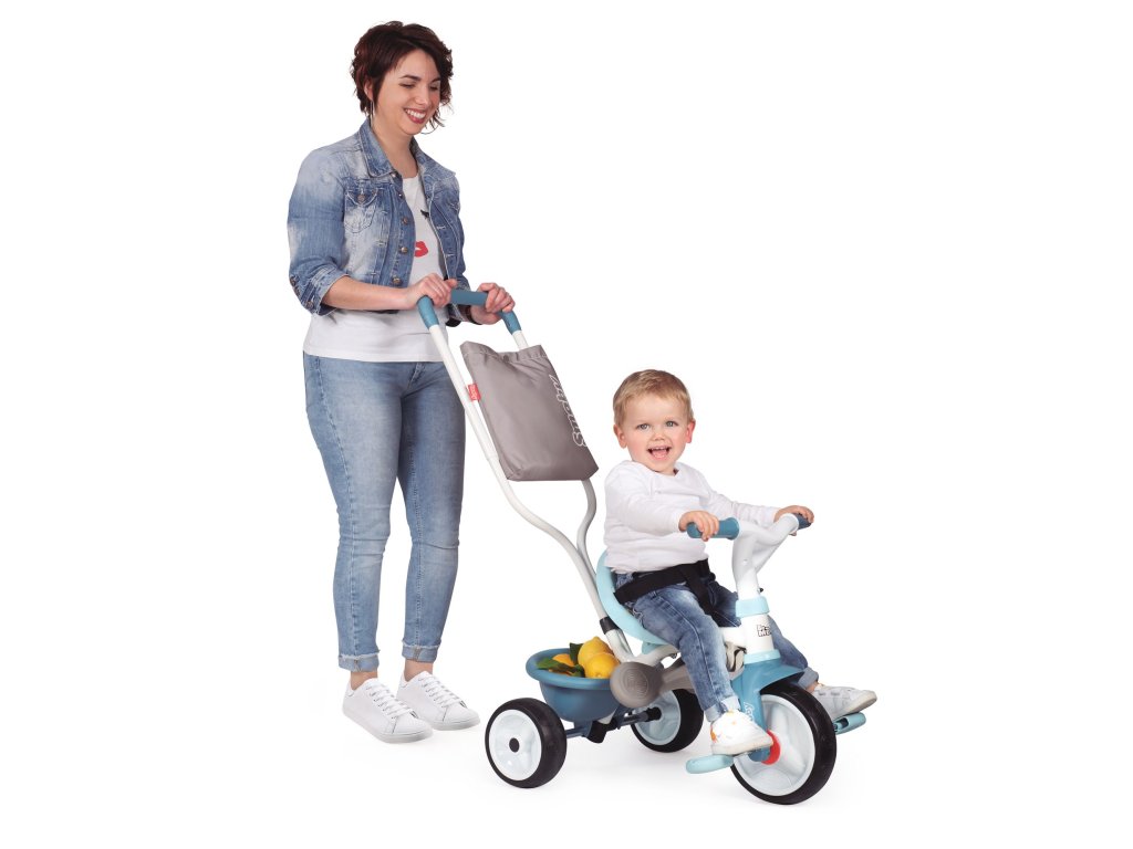 Šlapací tříkolka má kovový rám, odnímatelnou vodící tyč, bezpečnostní ochranný rám a pás, možnost zablokování šlapadel, výklopný plastový košík, nastavitelné ergonomické sedadlo na 2 pozice, plastová kolečka s tichou úpravou. Praktická taška na vodící tyči. Rozměry 68 x 101 x 52 cm.