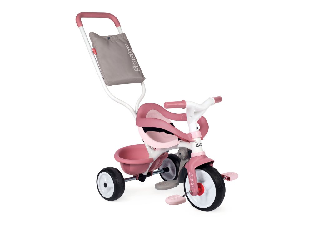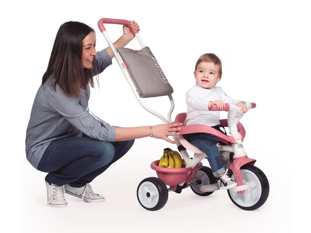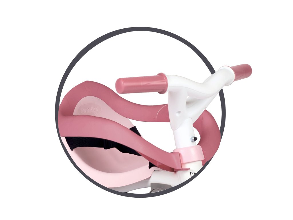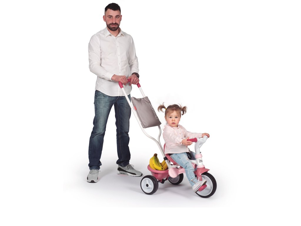 Šlapací tříkolka pro holčičky má kovový rám, odnímatelnou vodící tyč, bezpečnostní ochranný rám a pás, možnost zablokování šlapadel, výklopný plastový košík, nastavitelné ergonomické sedadlo na 2 pozice, plastová kolečka s tichou úpravou. Praktická taška na vodící tyči. Rozměry 68 x 101 x 52 cm.