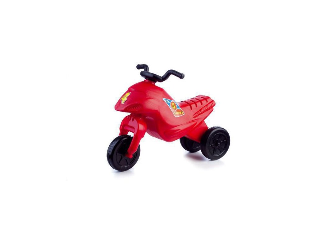 Odrážedlo Super Bike. Červená barva. Délka 58 cm, šířka 28 cm, výška 44 cm. 3 kola. Max nosnost 25 Kg.