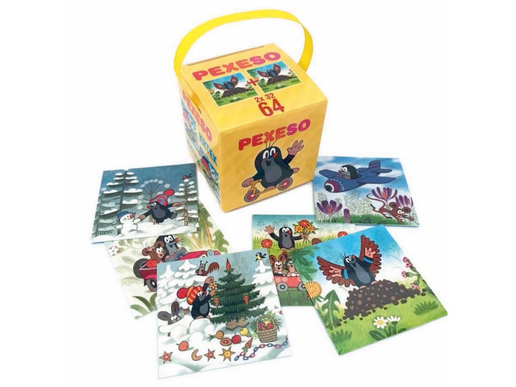 Pexeso v krabičce Krtek, celkem 64 kartiček, tedy 32 dvojic krabička opatřena stuhou, pro úchop dětskou rukou, či na zavěšení na prodejní řešení, paměťová hra, princip vyhledávání dvojic, návod uvnitř krabičky, hra podporuje soustředění.