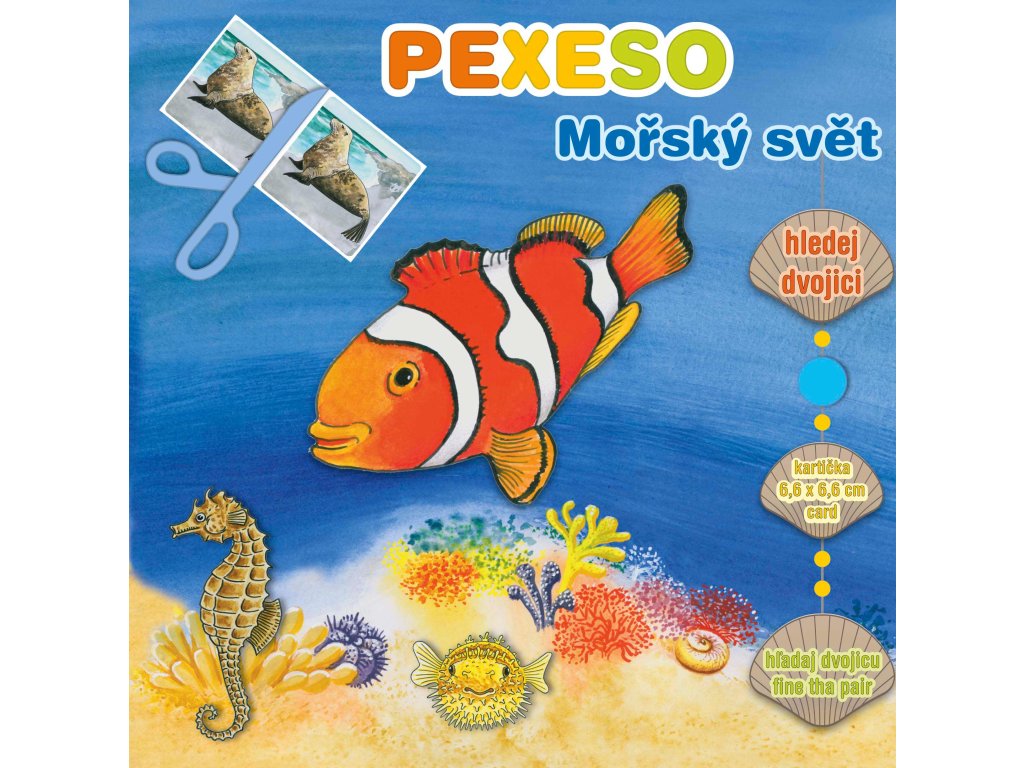 Pexeso v sešitu Mořský svět s maxi kartičkami o velikosti 6,6 x 6,6 cm. Na zadní straně je umístěna krabička k vystřižení pro vložení vystřižených kartiček. Tato velikost a materiál umožňuje i těm nejmenším hráčům snadnou manipulaci a čitelnost jednotlivých obrázků a usnadňuje zapamatování. Principem pexesa je vyhledávání dvou shodných kartiček. Výrobek podporuje soustředění. Taky výrobek vede k rozvoji paměti a logického myšlení.