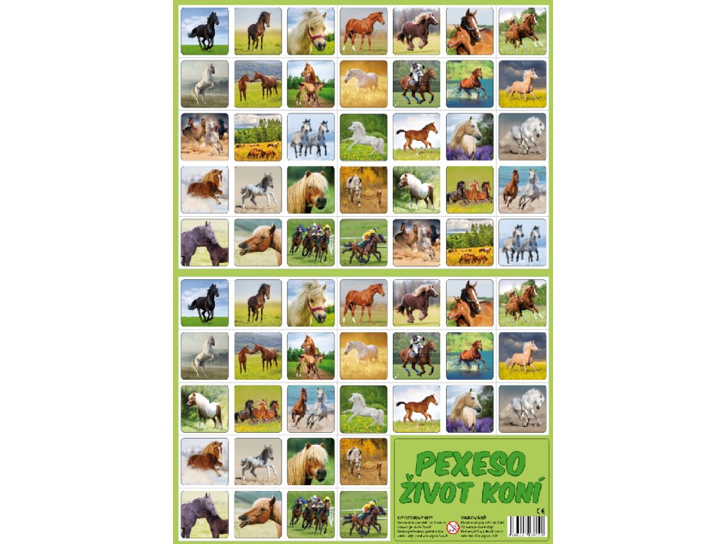 Společenská hra, při které si děti hravou formou trénují svou paměť. Hra se po rozstříhání skládá z 32 obrázkových dvojic. Pexeso 32 dvojic s obrázky koní.