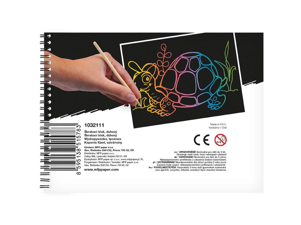 Vyškrabovací notes s perem. Dopřejte si chvilku odpočinku a kreativně se vydovádějte na vyškrabovacím notesu. Na jednotlivých listech můžete pomocí vyškrabovacího pera vytvářet různé pestrobarevné obrázky. Dítě si zlepší motoriku ruky a naučí se kreslit.NOTES OBSAHUJE:- 10 listů - 1 škrabátkoVAROVÁNÍ:Nevhodné pro děti do 3 let. Obsah malých částí - hrozí nebezpečí udušení.Dodáváme v plastovém sáčku.Uvedená cena je za 1 balení.