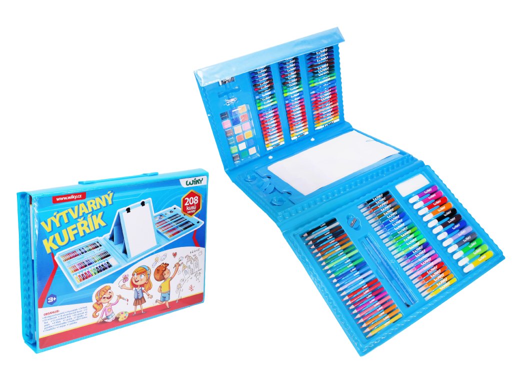Obsahuje: 48 olejových pastelů, 24 pastelek, 24 fixek, 24 voskovek, 18 akvarelových barev, 12 fixů, 15 prázdných listů, 30 sponek na papír, 4 klipy, 1 guma, 1 lepidlo, 1 pravítko, 1 ořezávátko, 1 tužka HB, 1 štětec, 1 houbička, 1 stojan, 1 paletka.