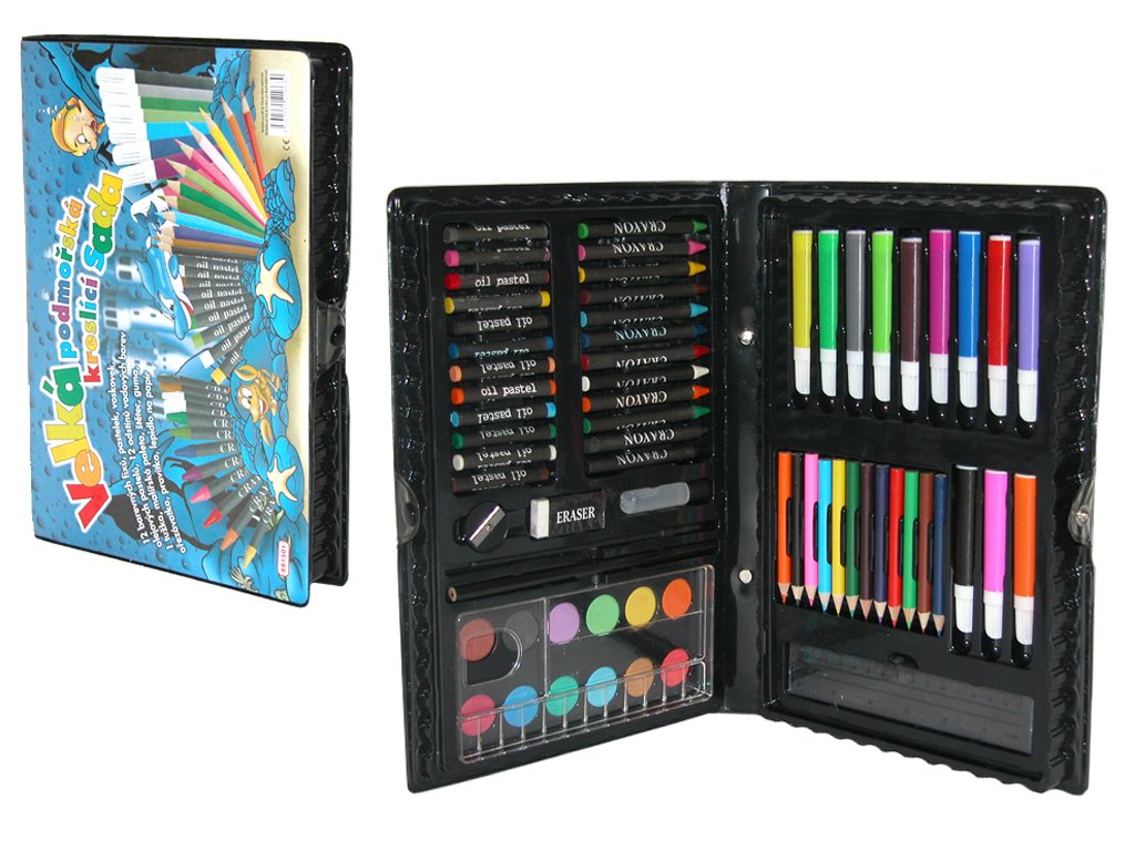 12 fixů, pastelek, voskovek a olejových pastelů, vodovky (12 odstínů), obyčejnou tužku, malířskou paletu, štětec, gumu, ořezávátko, pravítko, lepidlo na papír