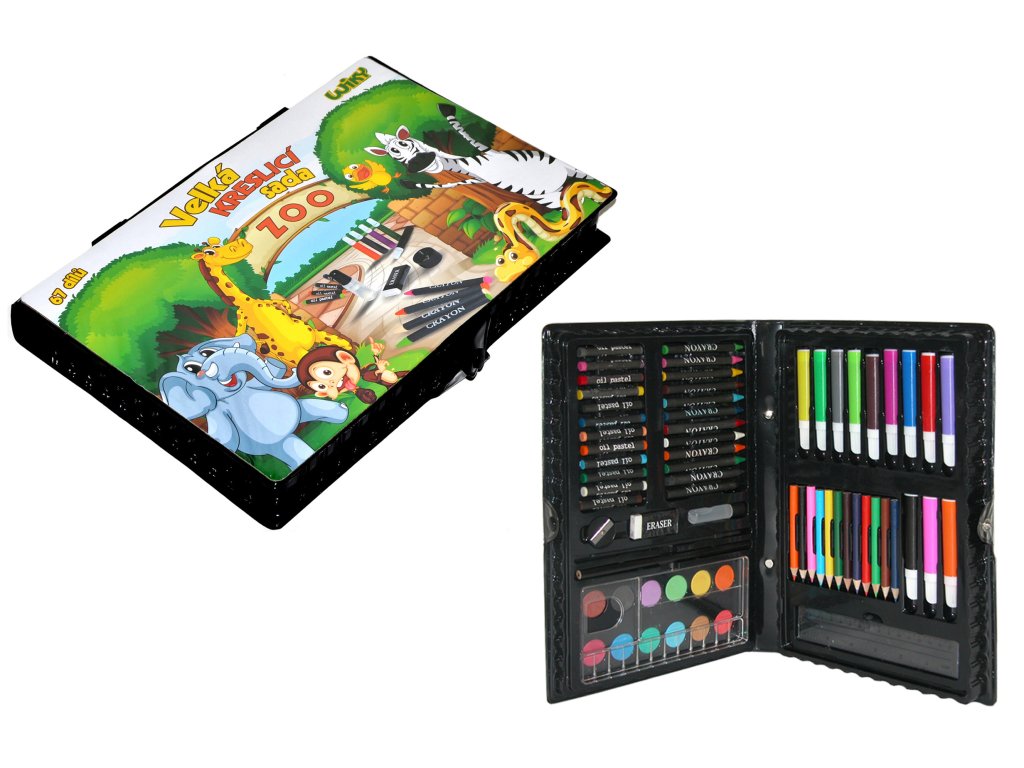 12 fixů, pastelek, voskovek a olejových pastelů, vodovky (12 odstínů), obyčejnou tužku, malířskou paletu, štětec, gumu, ořezávátko, pravítko, lepidlo na papír
