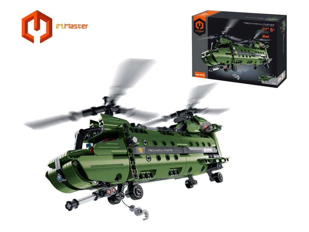 iM.Master Stavebnice vrtulník 2v1. Velikost vrtulníku se dvěma vrtulemi 34x17x12 cm, vrtulníku s jednou vrtulí 30x17x13 cm. 393 dílků. Lze sestavit dva různé modely vrtulníku z jedné sady dílků. Složený model má manuálně pohyblivé části (vrtule, naviják, otáčení děla).