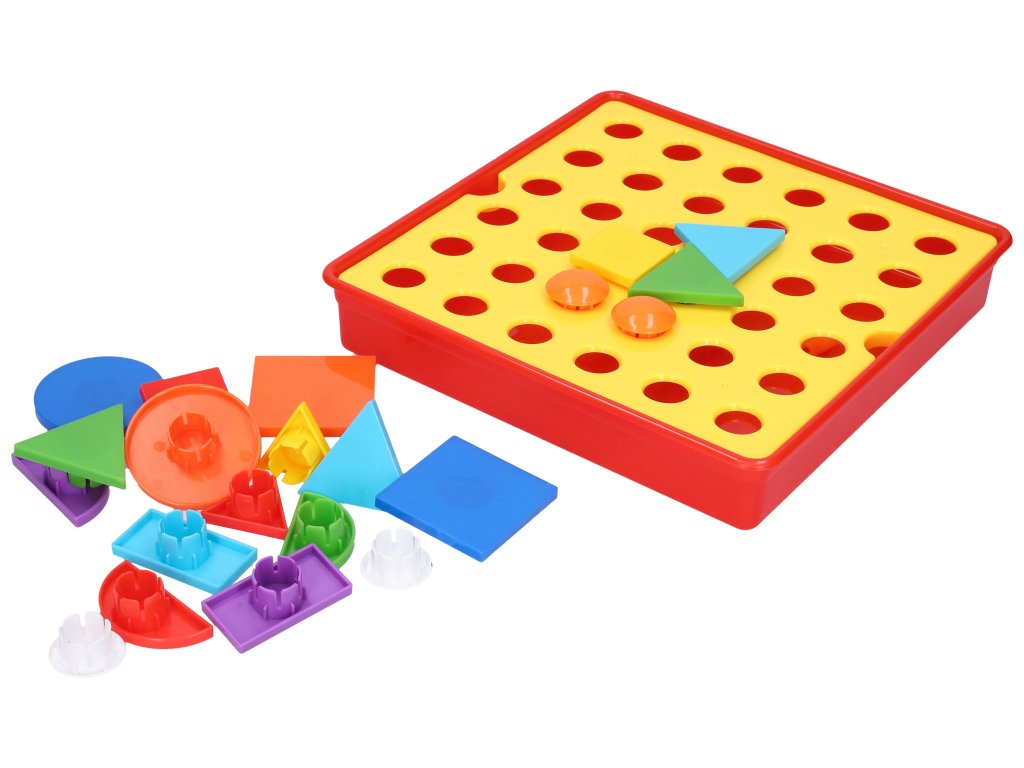 Mozaika geometrické tvary. Velikost 25x25 cm. Balení obsahuje krabičku s podložkou a šablonami na vkládání tvarů. 22 tvarů, 12 obrázků(šablon)