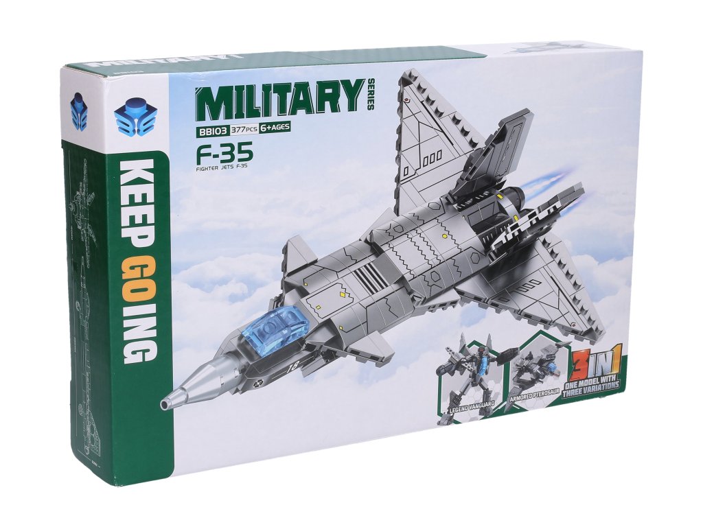 Stíhačka stavebnice 3v1. Velikost stíhačky 28cm. Ze stavebnice lze složit stíhačku, robota, ozbrojeného pteosaura. Obsahuje 377dílků.