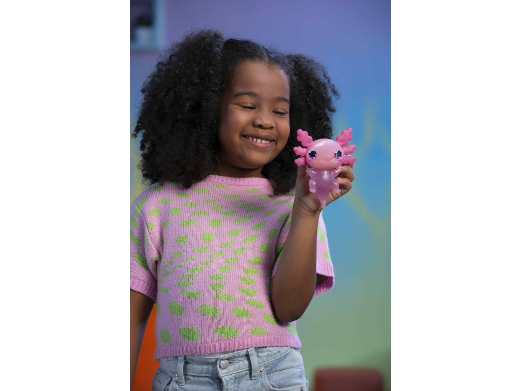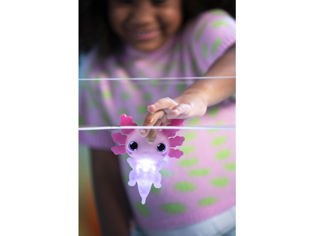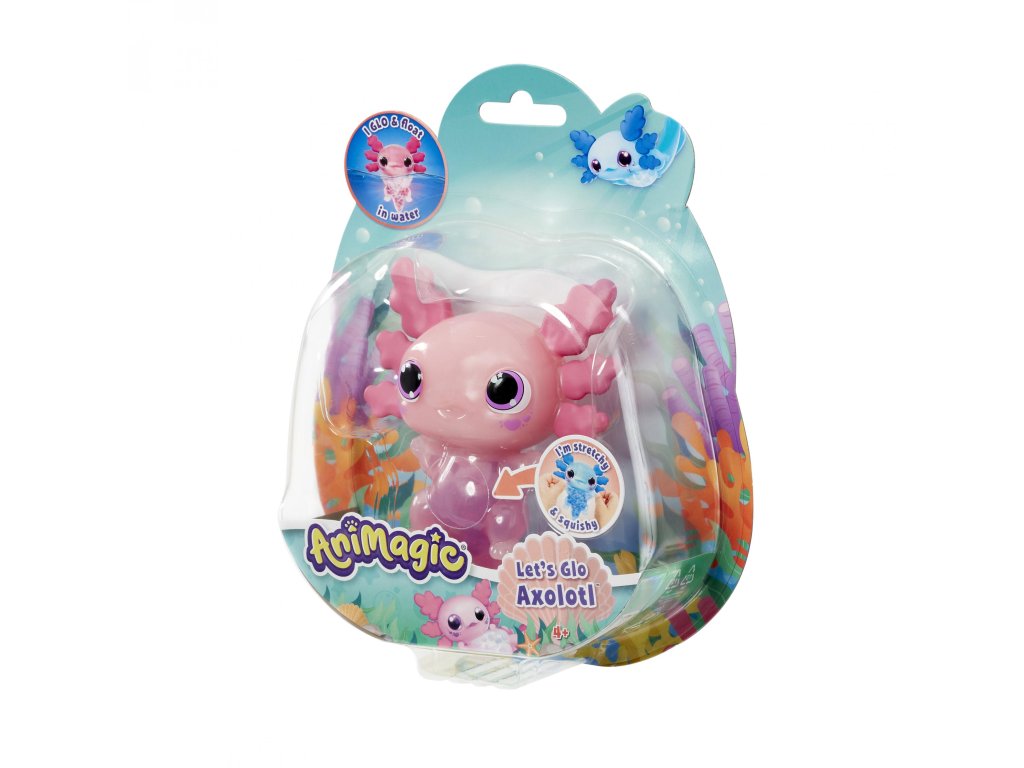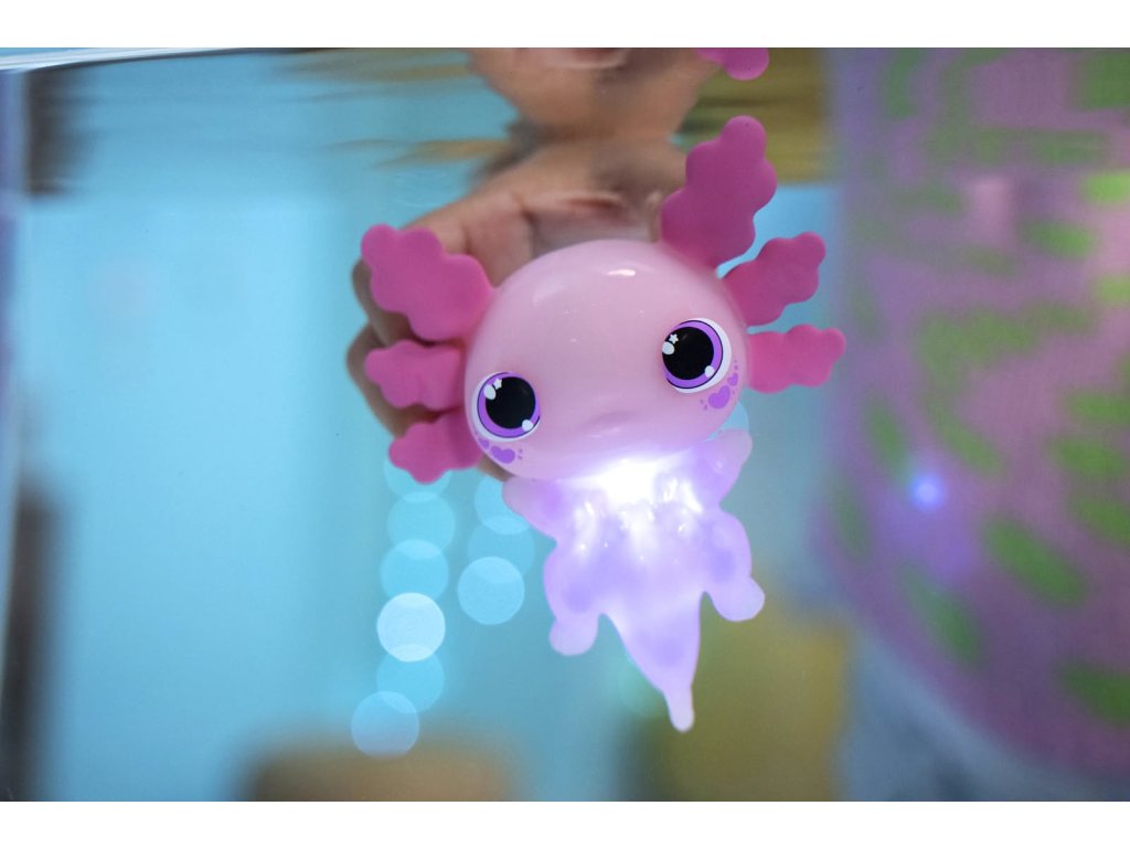 Figurka axolotla, která po ponoření do vody začne svítit. Tato hračka je vyrobena z měkkého, pružného materiálu, který je příjemný pro dětské ručičky.