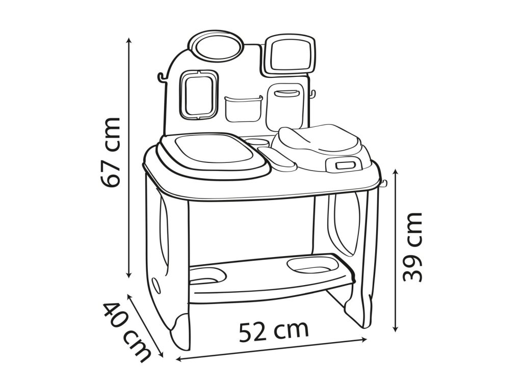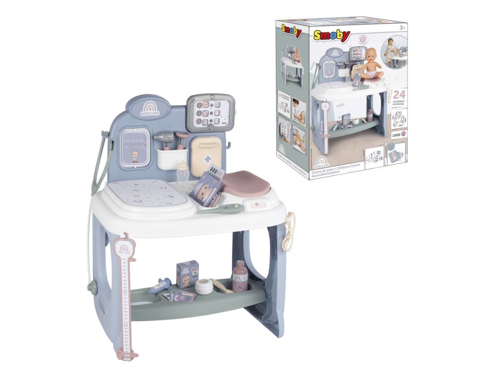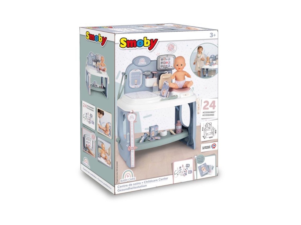 Baby Care centrum umožňuje dětem hrát si na dětského lékaře, vyšetřovat a léčit drobné bolístky jejich panenek, vhodné pro panenky do 38 cm. Skládá se z několika herních ploch a obsahuje spoustu doplňků: samolepící lékařský štítek, lékařské brýle, elektronický tablet (baterie nejsou součástí dodávky), otočná obrazovka s testem zraku a srdečního tepu, brožurka zdravotních záznamů a lékařské formuláře. Součástí je i dětská váha, teploměr, vyšetřovací stůl , stetoskop, otoskop a další. Celkem obsahuje 26 ks příslušenství. Nechybí úložný koš, lékárnička s výklopnou zásuvkou, police, háčky. Vyjímatelný elektronický tablet umožňuje hrát si a povzbuzovat dítě ke hře s panenkou a doplňky. Náhodně se spouští LED a zvuk, který dítěti signalizuje, co je špatně a co má dělat. 3 tlačítka na tabletu, několik zvuků. Dětská panenka není součástí balení. Vyrobeno ve Francii.