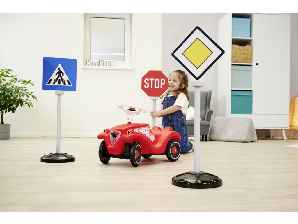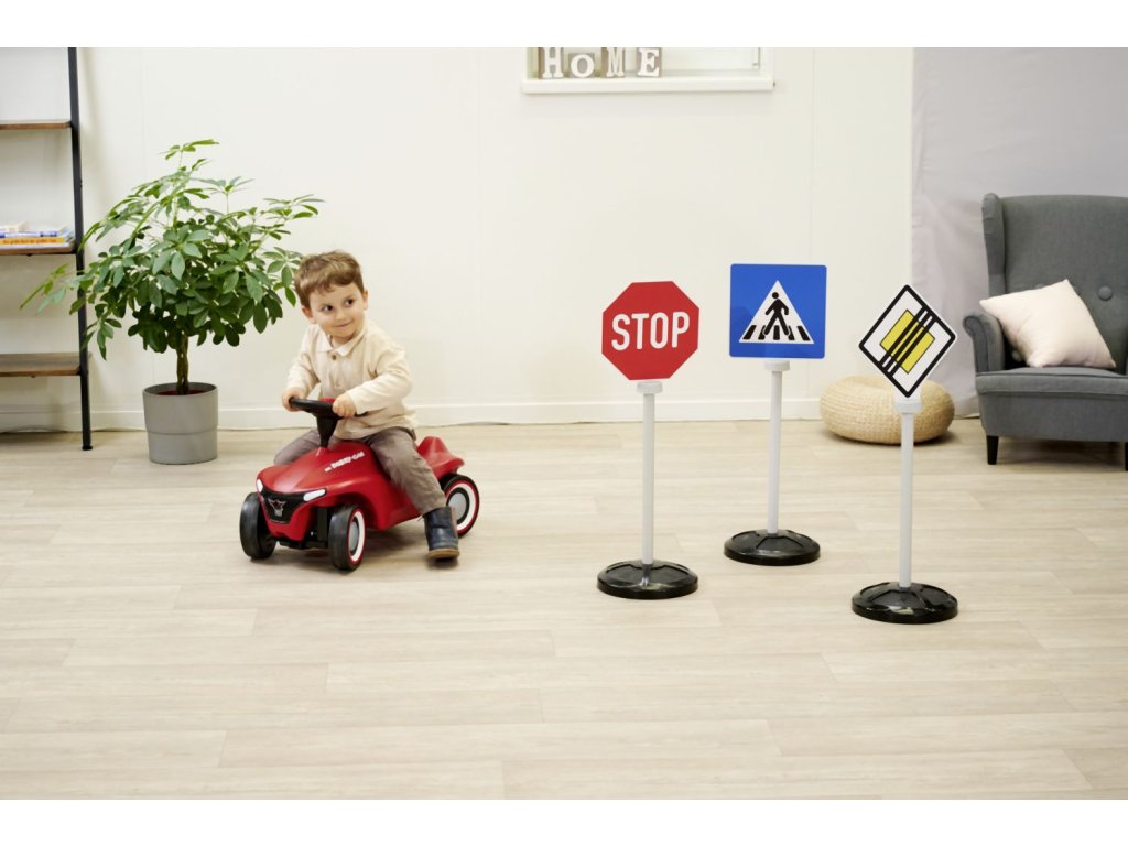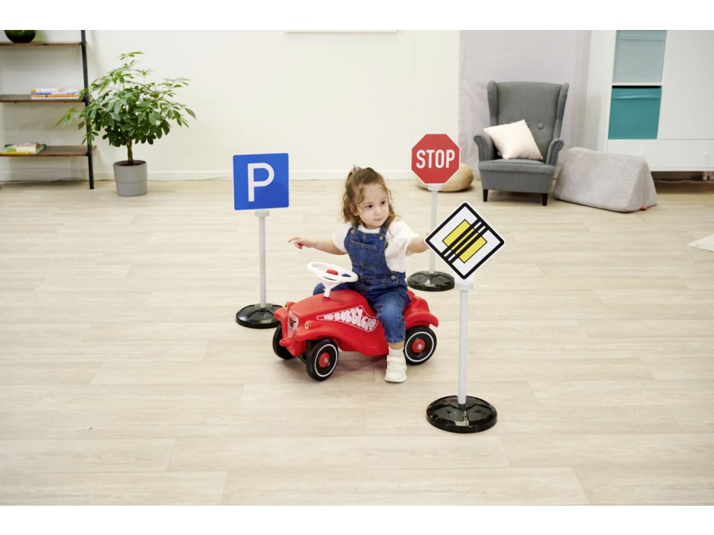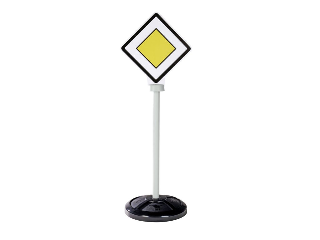 Set 3 dopravních značek s 5 originálními symboly, potisknutými oboustranně - hlavní silnice/konec hlavní silnice, stop/stop, parkování/přechod pro chodce. Dopravní značky jsou odolné vůči UV záření a neztrácejí barvu, se stojanem. Výška značky 69 cm. Celková váha 0,8 kg.