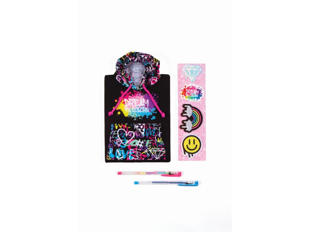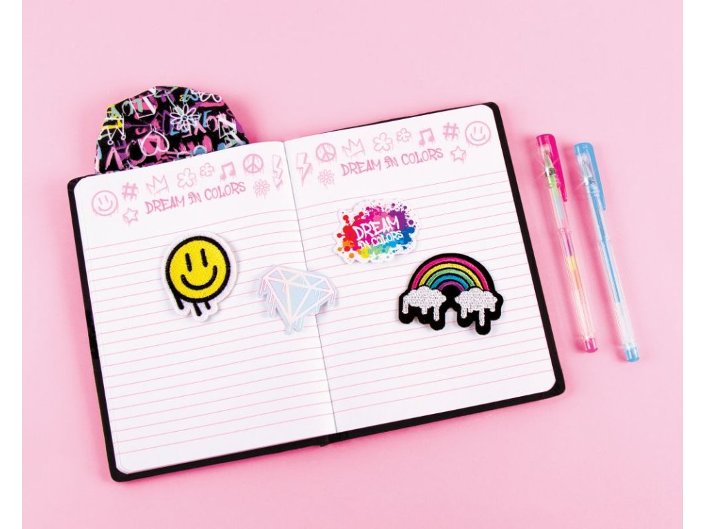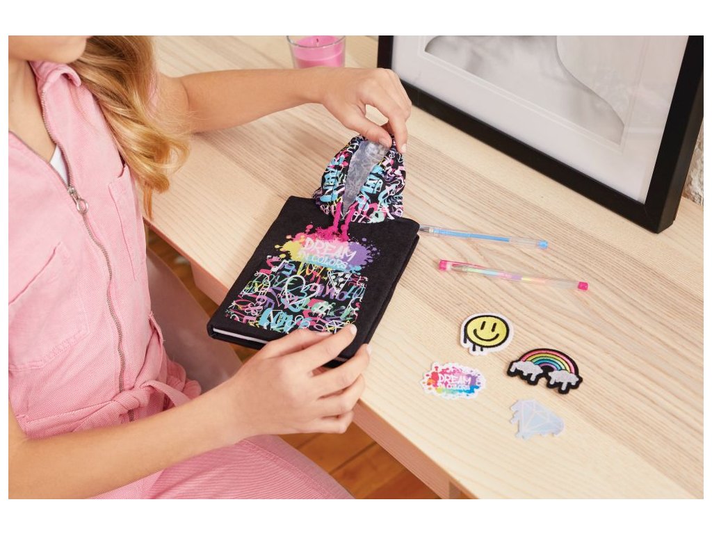 Designový blok ve stylu street look. Blok má na hlavních deskách kapuci. Zapiš si do bloku tvé zážitky nebo třeba tajné sny. Součástí balení jsou dvě propisky, samolepky a lepící nášivky. Vhodné pro dívky od 8 let.