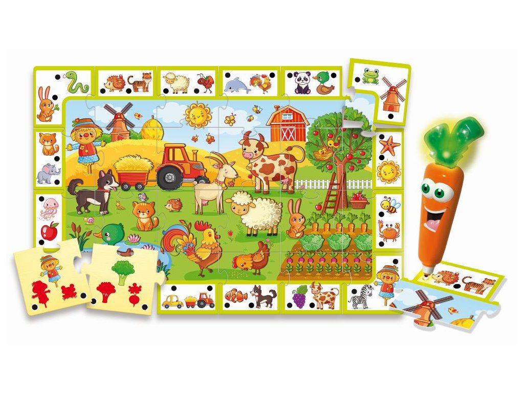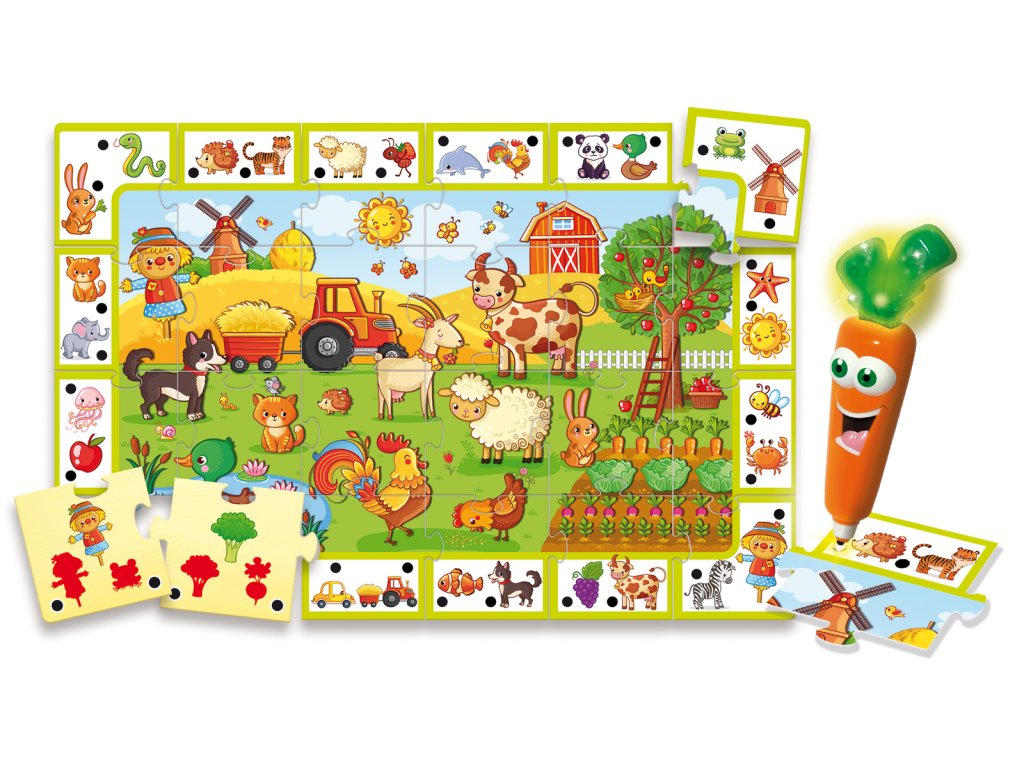 Carotina miluje přírodu a pobyt na venkově! Sestavte obrázek z oboustranných dílků a poznávejte hospodářské zvířata pomocí jednoduchých a zábavných kvízů. K odpovědi použijte mluvící tužku v podobě mrkvičky. Vhodné pro děti od 3 let.