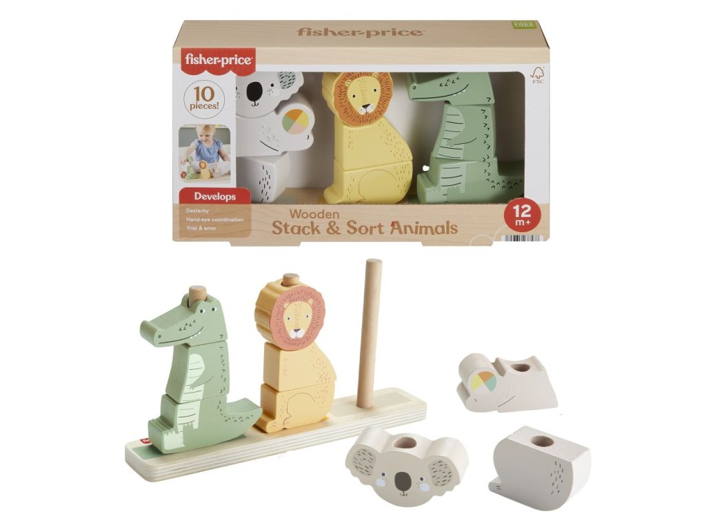 S dřevěnou skládačkou zvířátka od Fisher-Price® můžete nechat své děťátko rozvíjet fantazii! Děti mohou skládat dílky na základnu a vytvořit krokodýla, lva, koalu nebo jakékoliv jiné zvíře, které si jen dokáží představit! Třídění a skládání jim navíc pomáhá rozvíjet jemnou motoriku a dovednost řešit problémy. Vyrobeno ze dřeva z dobře obhospodařovaných lesů s certifikátem FSC.