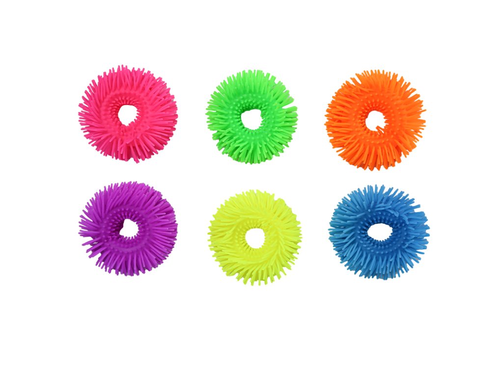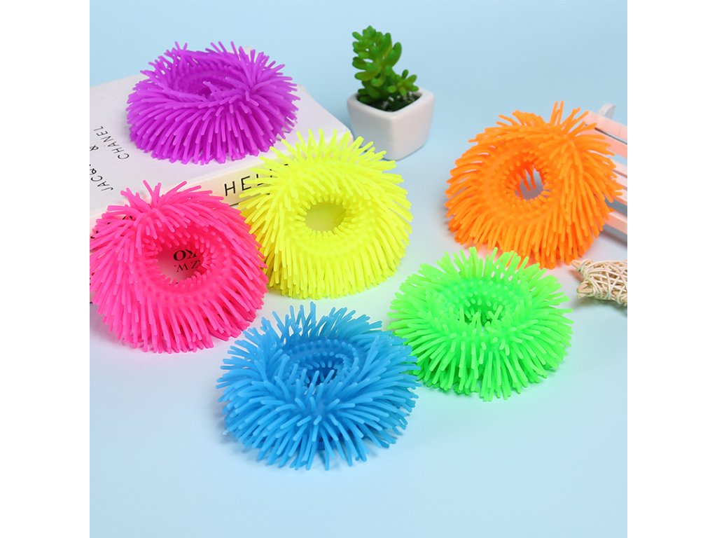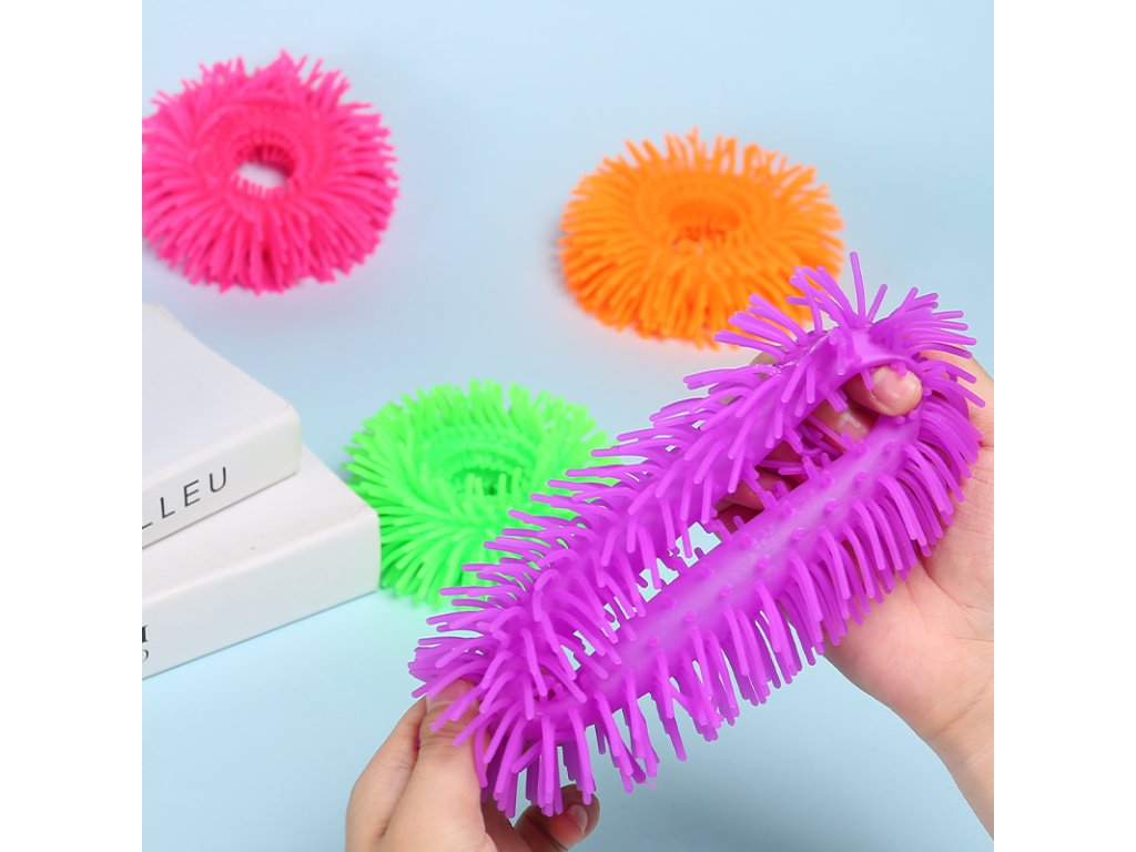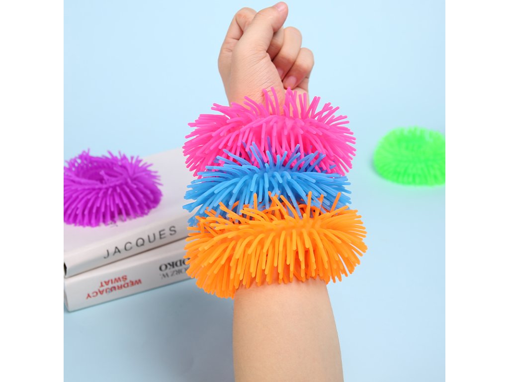 Je vyroben z měkkého a pružného gumového materiálu, který je bezpečný pro děti a příjemný na nošení. Náramek má střapatý design s různobarevnými výčnělky, které se dají mačkat a natahovat, což dětem poskytuje smyslovou stimulaci a pomáhá jim soustředit se a uklidnit.