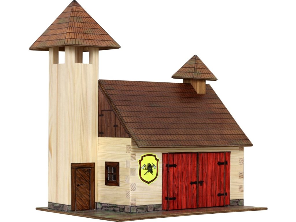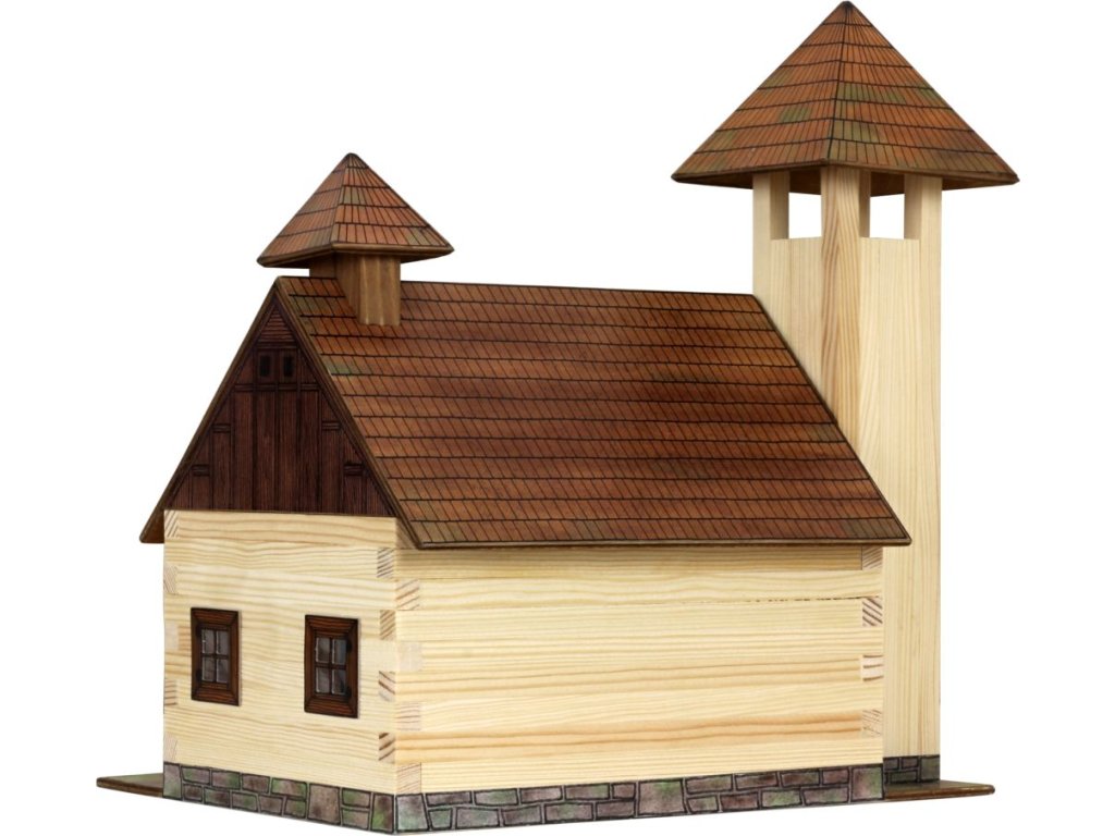 Dřevěná slepovací stavebnice obsahuje dřevěné hranolky daných délek ke stavbě roubených stěn, díly na střechy a štíty, kartonové výseky oken a dveří i předtištěné papírové potisky. Součástí stavebnice je schématický montážní plán.