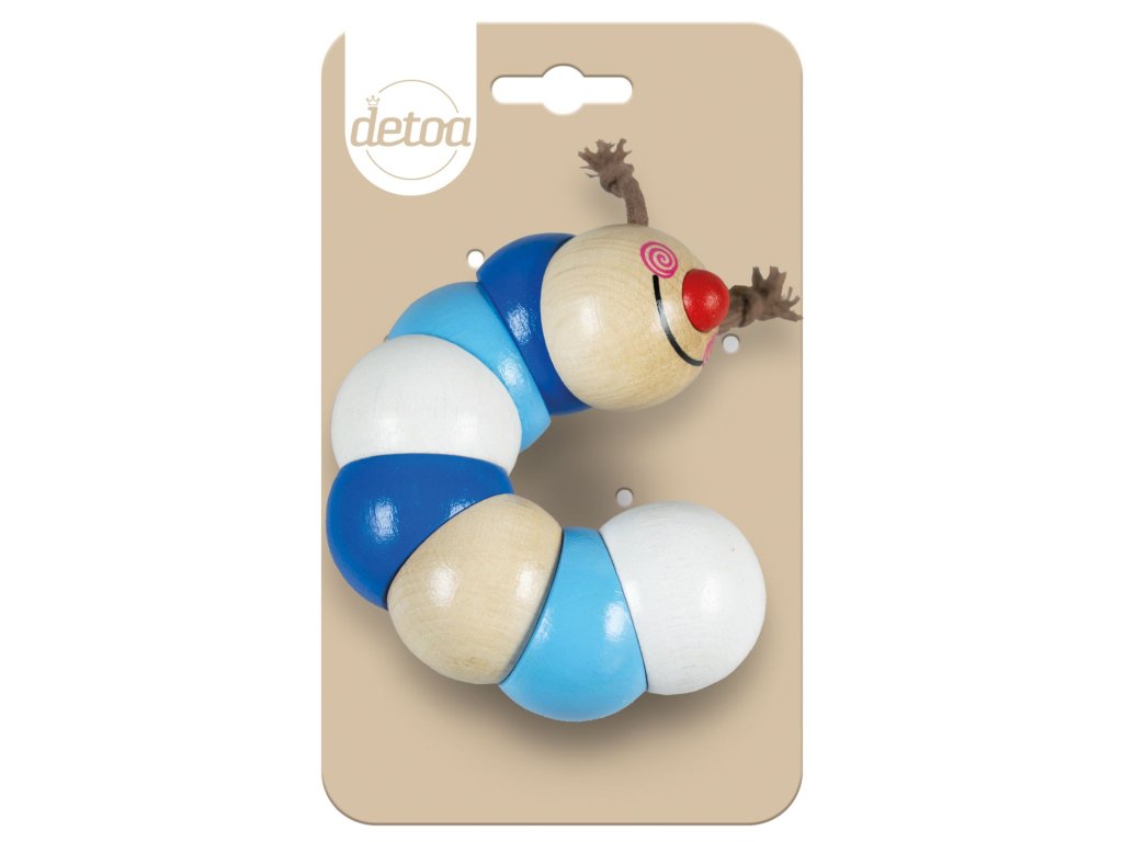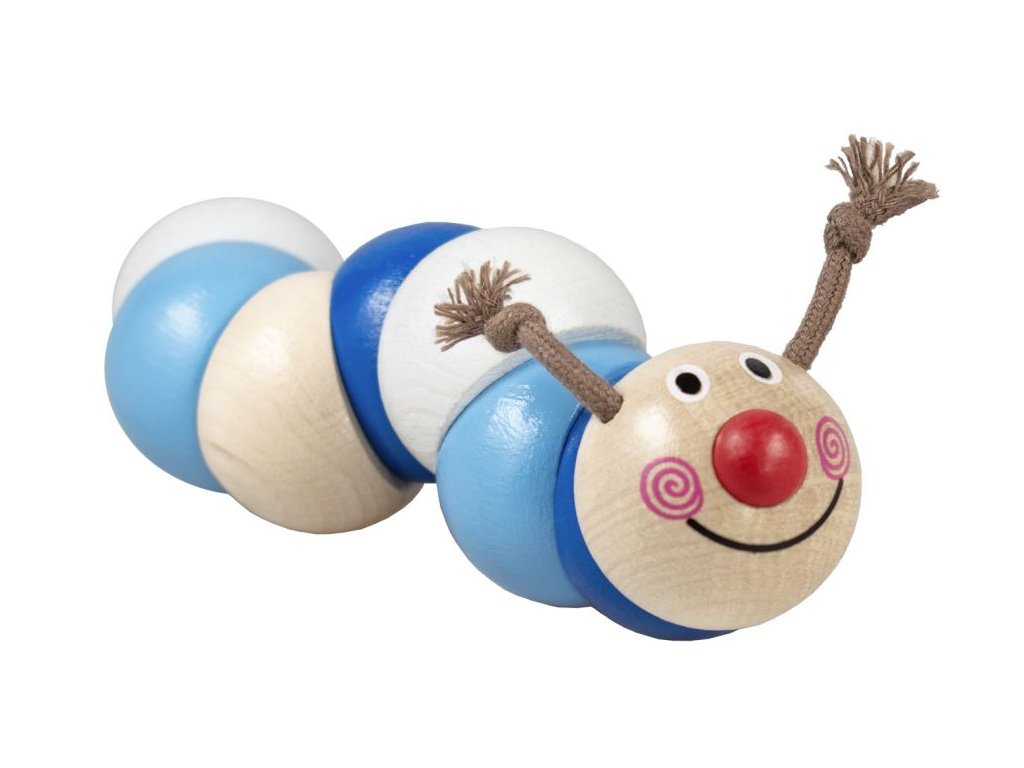 Hračka v podobě housenky z barevných dřevěných perlí navlečených na gumě, které se pohybují, točí a ohýbají.