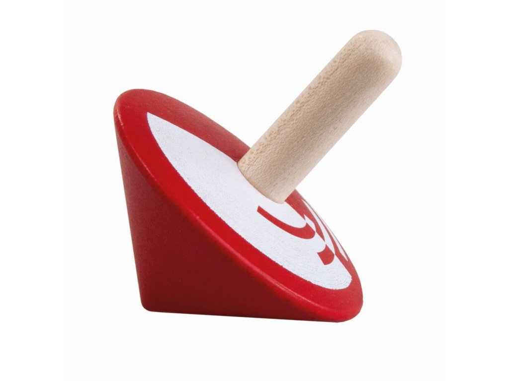 Dřevěná točící káča v červené barvě pomáhá rozvíjet jemnou motoriku prstů.