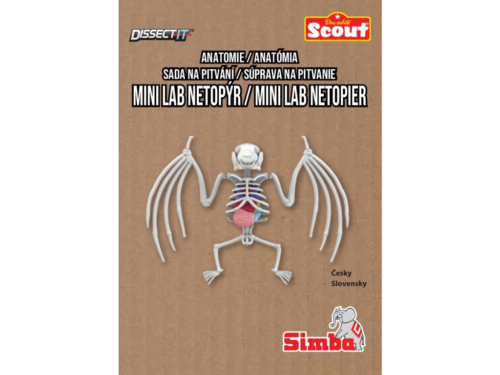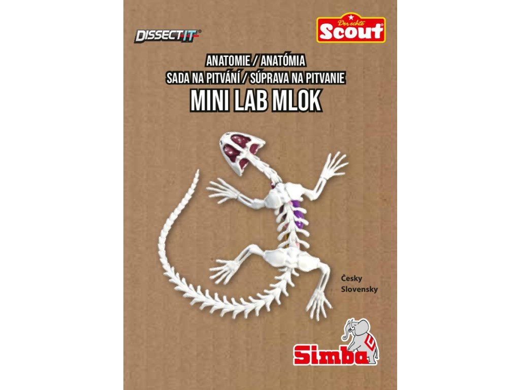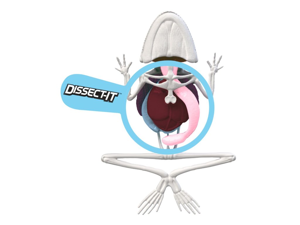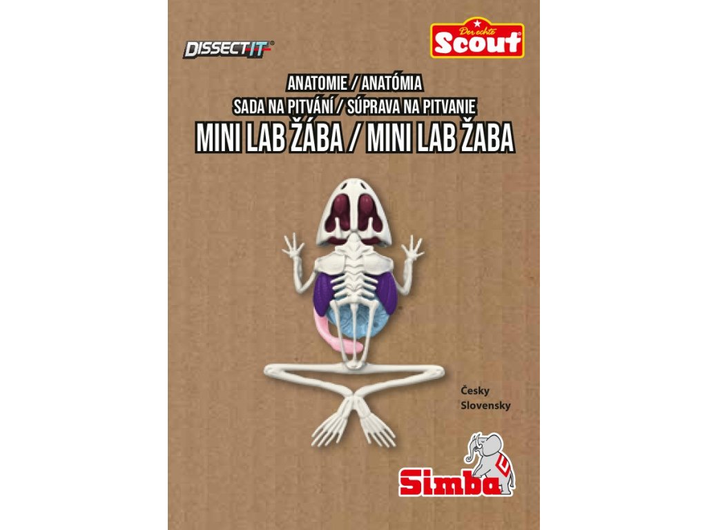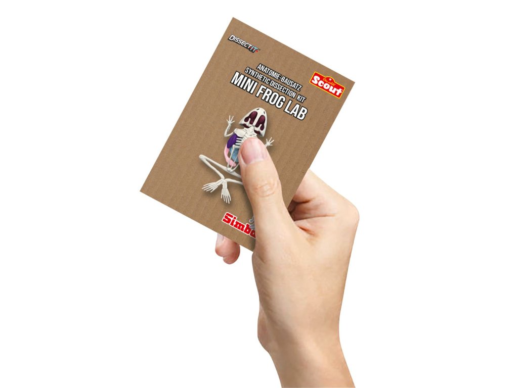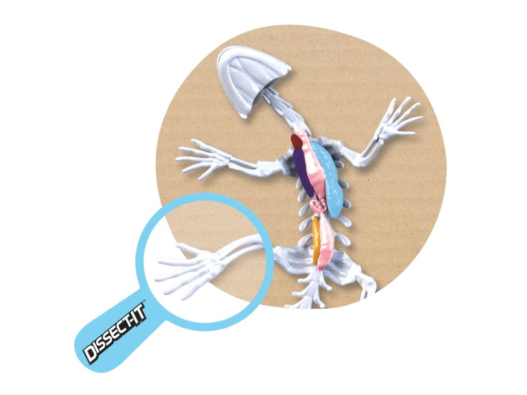 Malá laboratoř pro pitvu žáby, mloka či netopýra, jejichž kosti a orgány jsou pokryty slizem. Součástí je lupa a pinzeta. Velikost 8 cm.