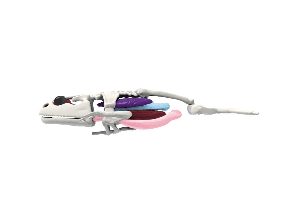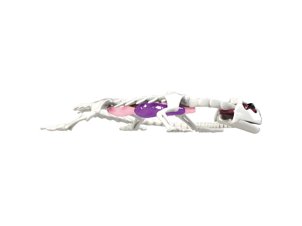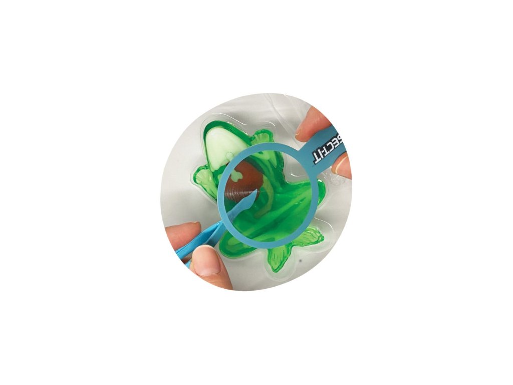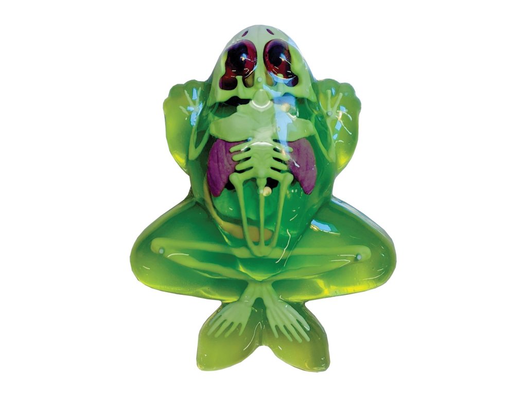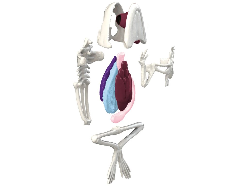 Malá laboratoř pro pitvu žáby, mloka či netopýra, jejichž kosti a orgány jsou pokryty slizem. Součástí je lupa a pinzeta. Velikost 8 cm.