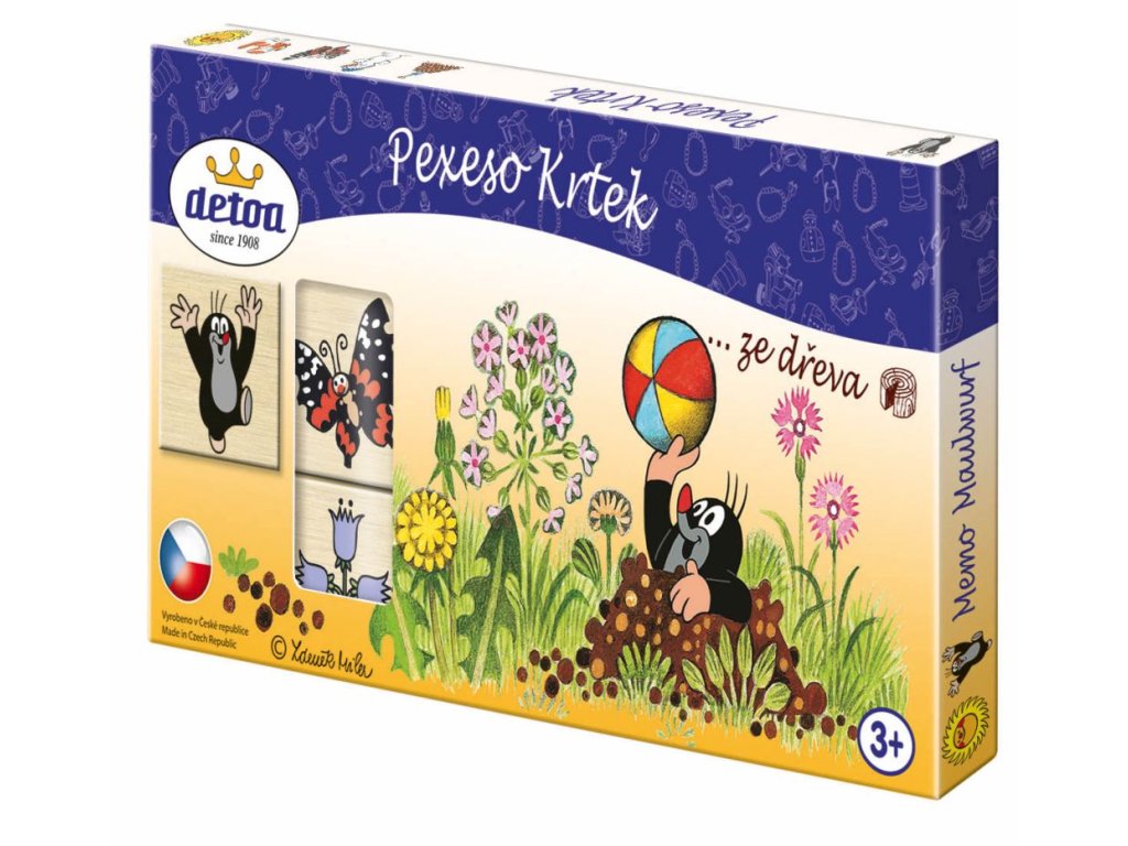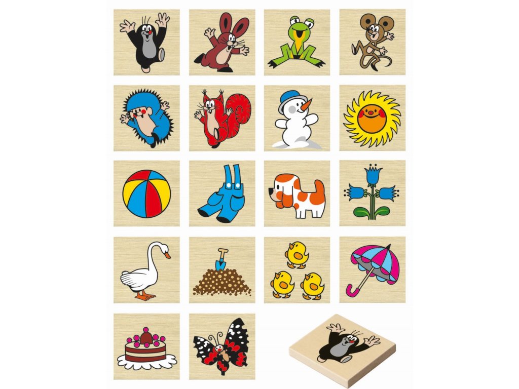 Pexeso z dřevěných kamenů o rozměrech 40x40x6mm s veselými obrázky Krtka a jeho přátel. Procvičování a soustředění paměti dětí.