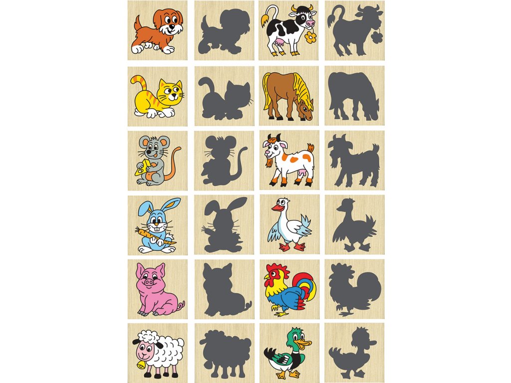 Pexeso z dřevěných kamenů o rozměrech 40x40x6mm s potiskem zvířátek a jejich stínů. Hra procvičuje přestavivost a paměť dítěte.