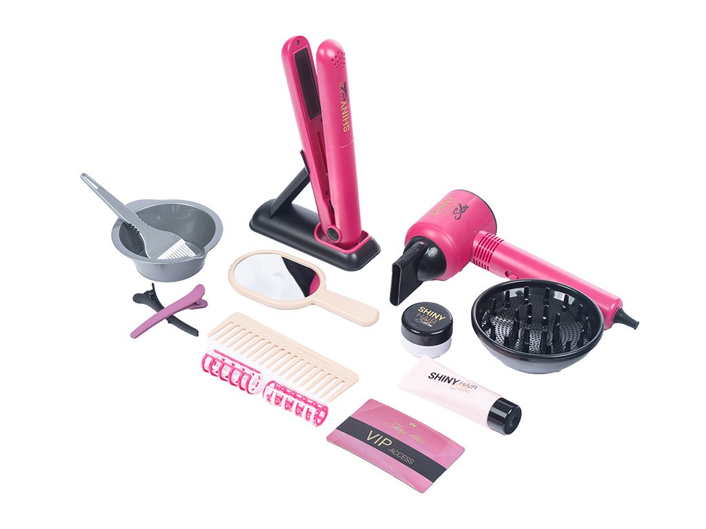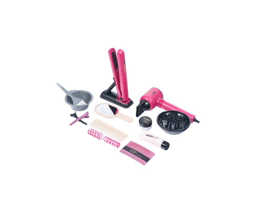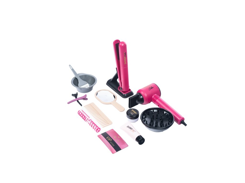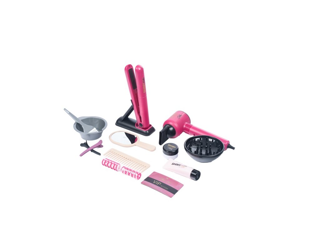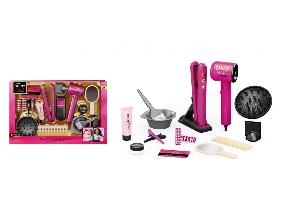 Velká kadeřnická sada obsahuje 16 ks. Fén je na baterie. Hřeben, nůžky, žehlička na vlasy, sadu na barvení vlasů..