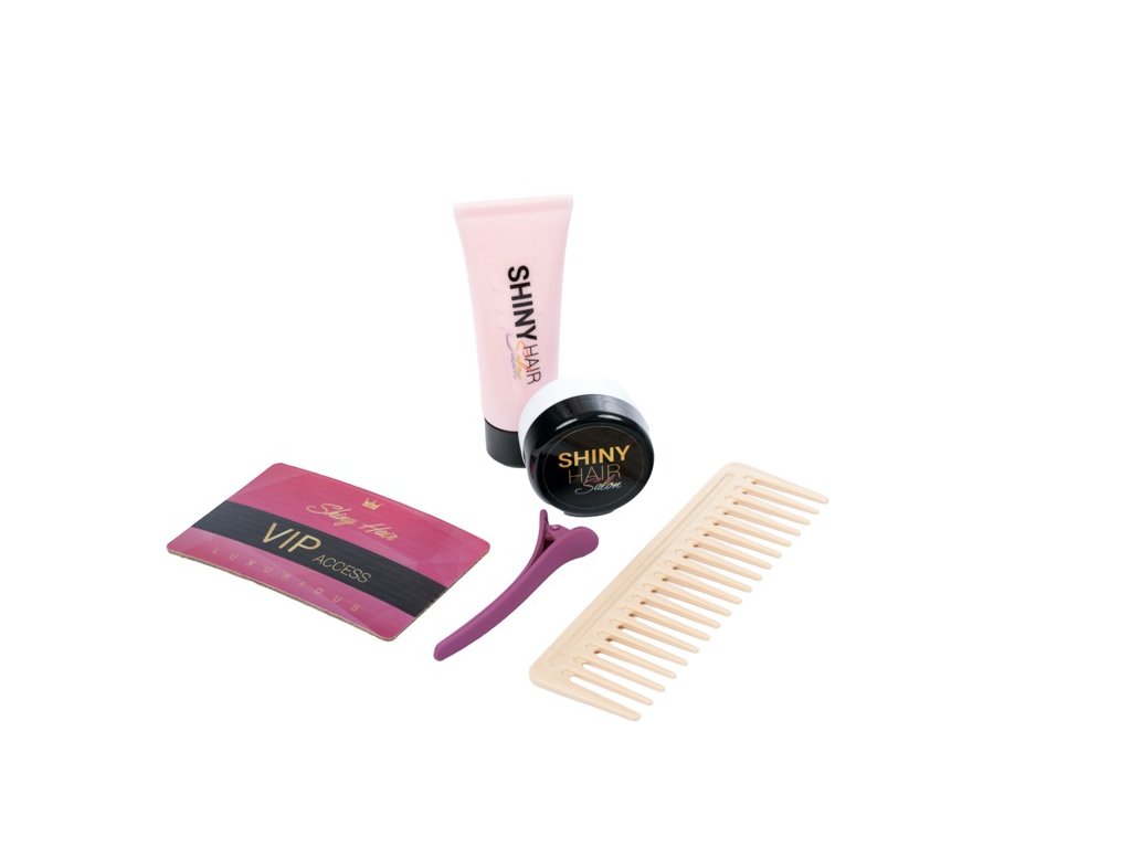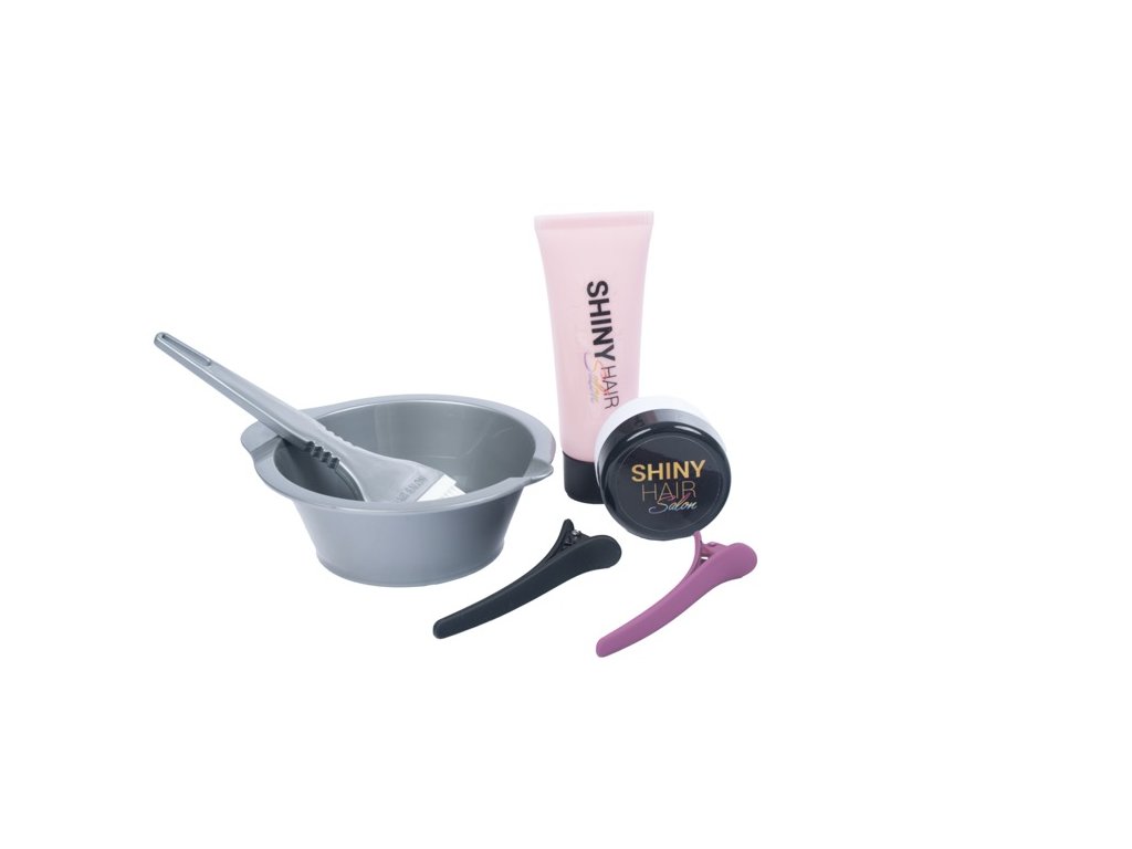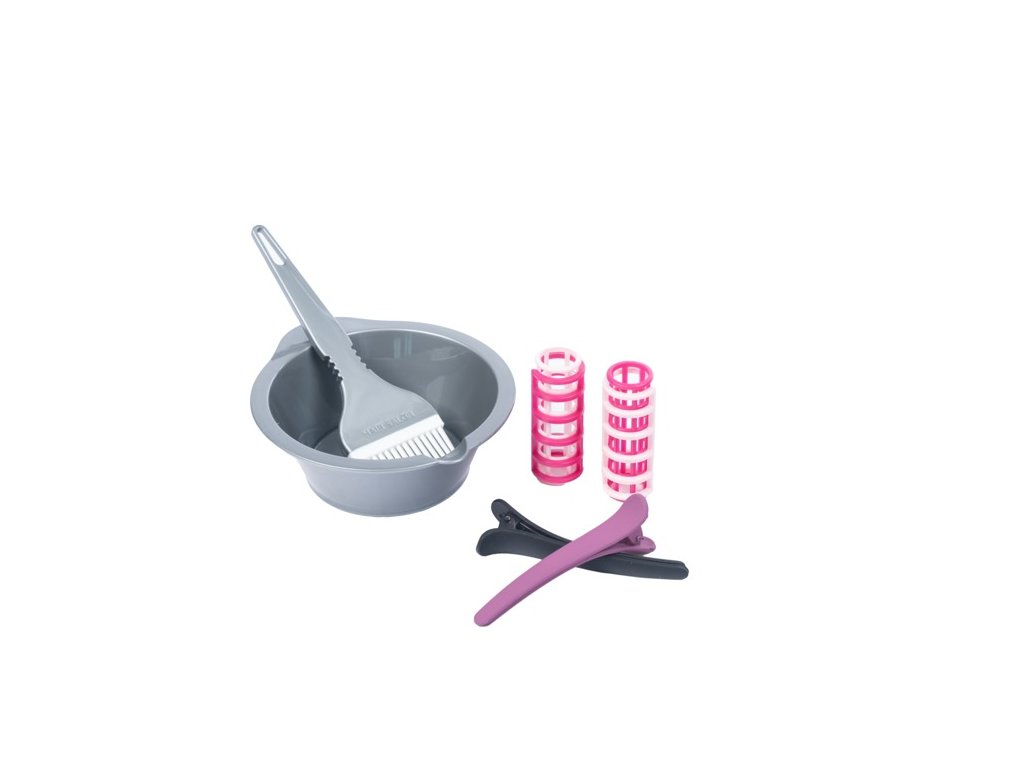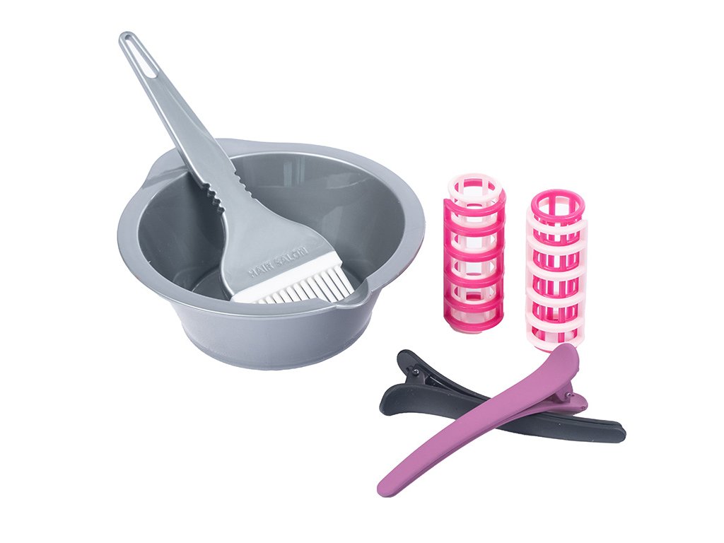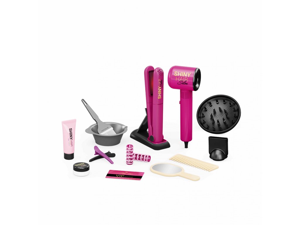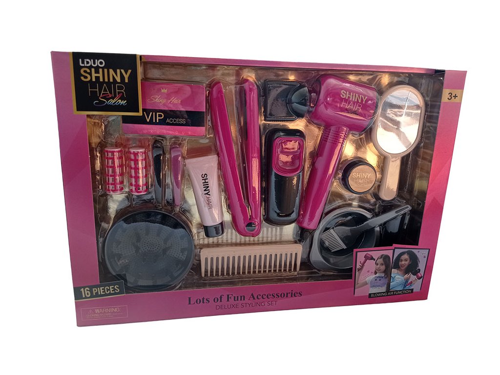 Velká kadeřnická sada obsahuje 16 ks. Fén je na baterie. Hřeben, nůžky, žehlička na vlasy, sadu na barvení vlasů..