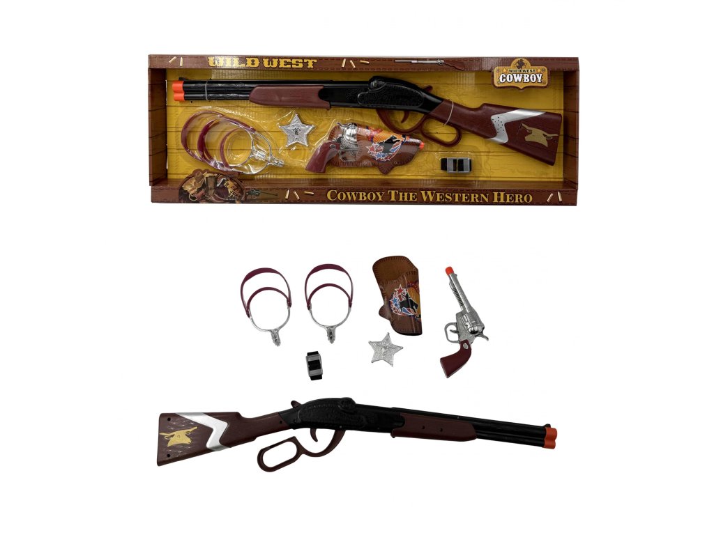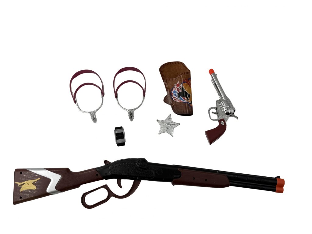 Sada obsahuje velkou pušku se zvuky, kolt s pouzdrem, ostruhy jako pro opravdového kovboje a šerifův odznak.
