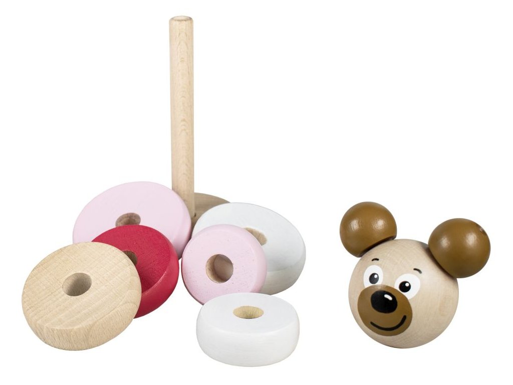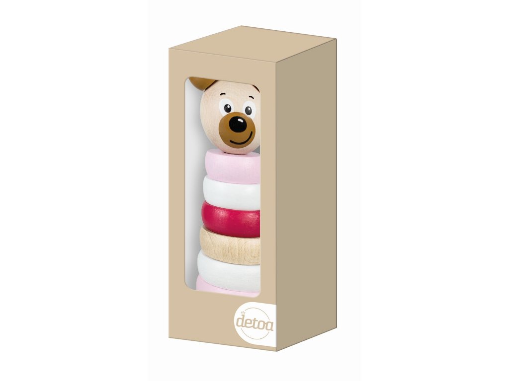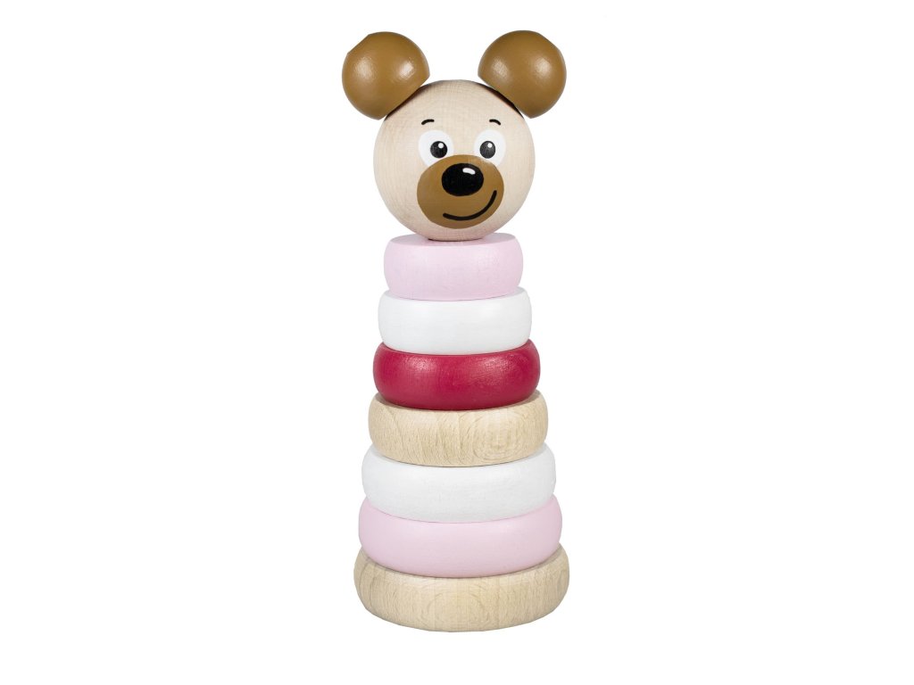 Dřevěná skládací pyramida s motivem medvídka, rozvíjí představivost, logické myšlení a motorické schopnosti dítěte. V růžové variantě.