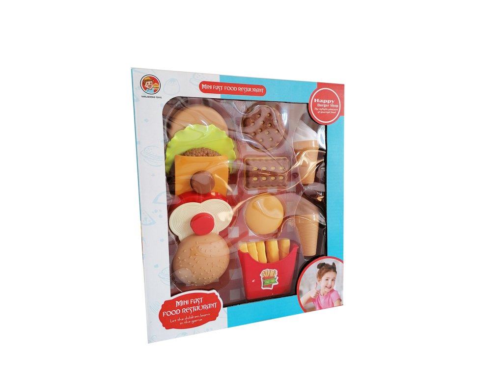 Sada plastových potravin, které se prodávají ve Fast Foodech. Hamburgery, hranolky, zmrzliny..