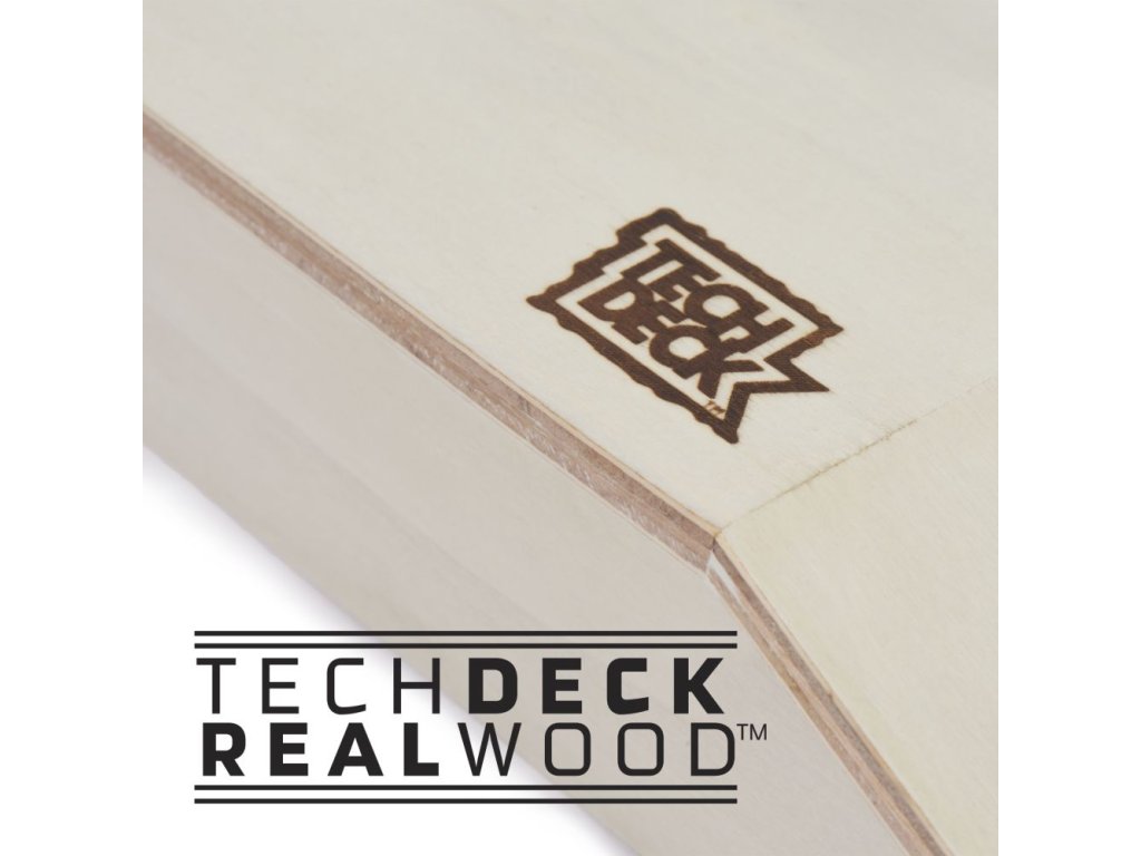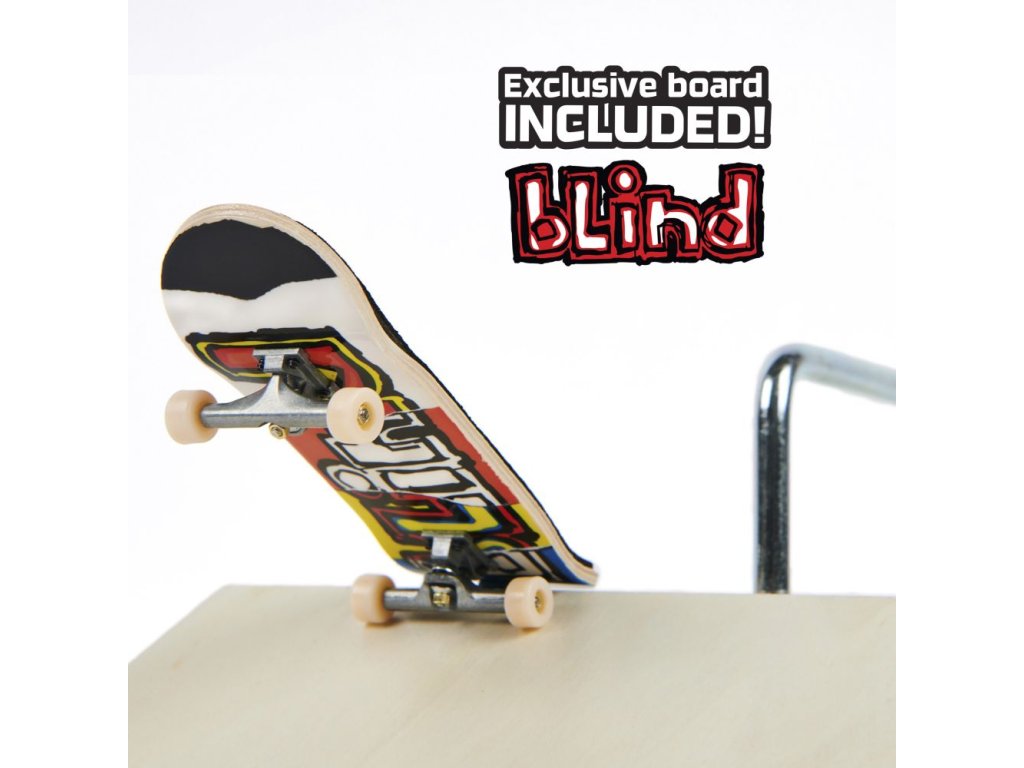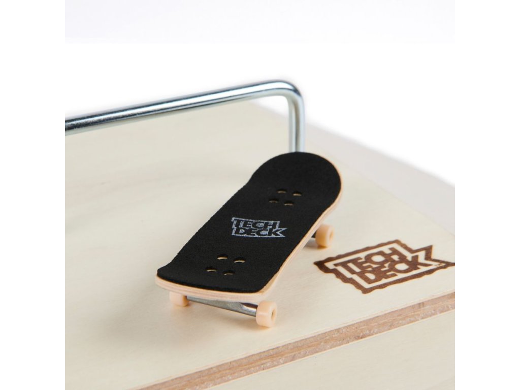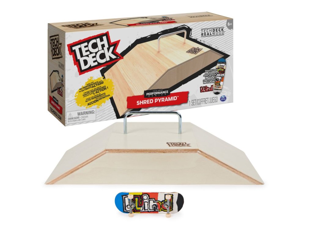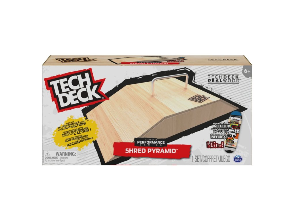 Tech Deck Performance Series Shred Pyramid Set napodobuje pocit, který zažijete ve skutečném skateparku. Dvojitá rampa ze skutečného dřeva a fingerboardy jsou vyrobeny s použitím vysoce výkonných dílů pro dokonalou hru. Sklouzněte po kovovém zábradlí a předvádějte triky jako profesionál na Shred Pyramid! Dřevěné prkno umožňuje ještě dokonalejší triky a je vyzdobeno grafikou jedné z nejvýznamnějších skateboardových značek Blind Skateboards. Díky pěnové pásce máte vše pod kontrolou a můžete řádit jako fingerboardový profesionál. Měkká gumová kolečka působí jako opravdový skate a umožňují vám mít své prkno dokonale pod kontrolou. Gumové bushingy dovolují ostřejší zatáčení a nabízejí realističtější zážitek při provádění triků. Fingerboardy Tech Deck jsou určené pro milovníky skateboardů od 6 let. Předveďte své nejlepší triky na Performance Series Shred Pyramid!