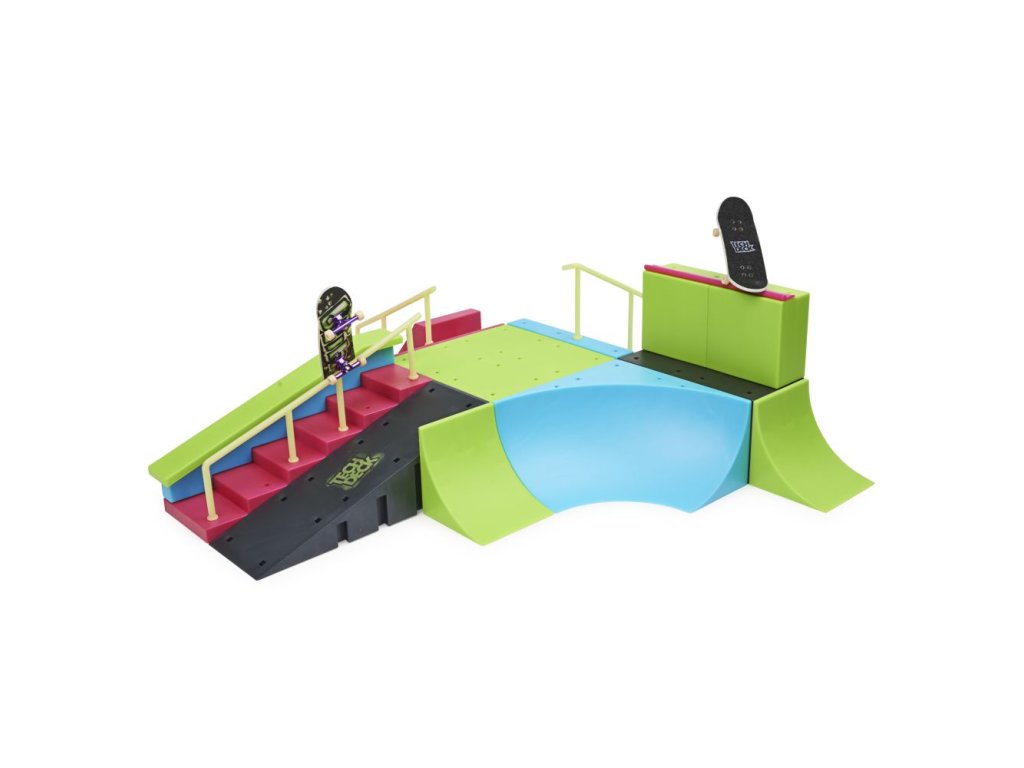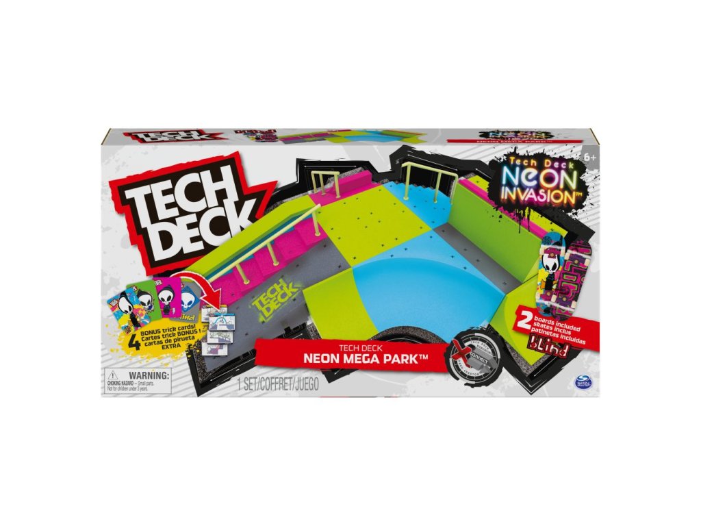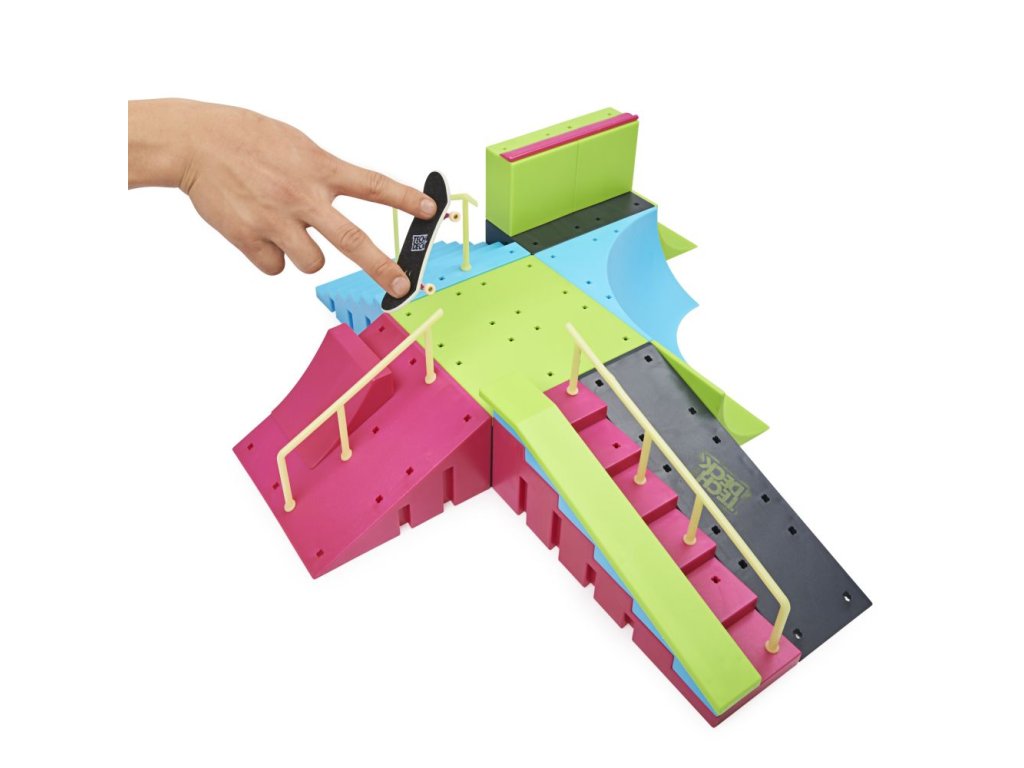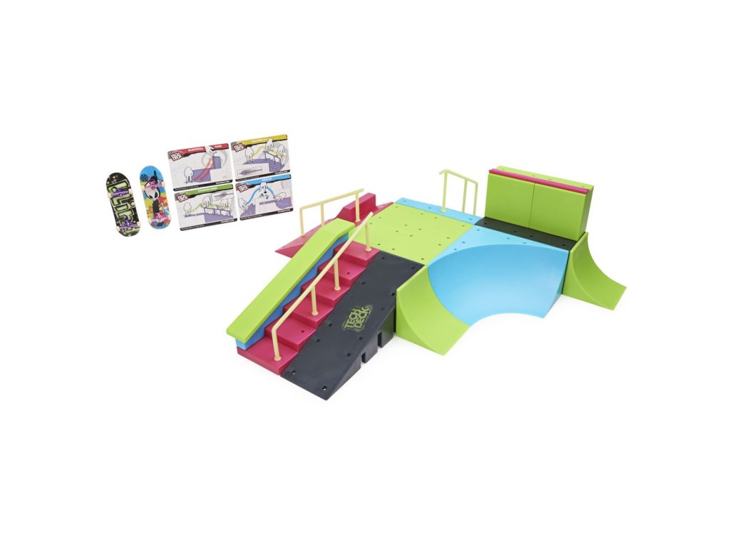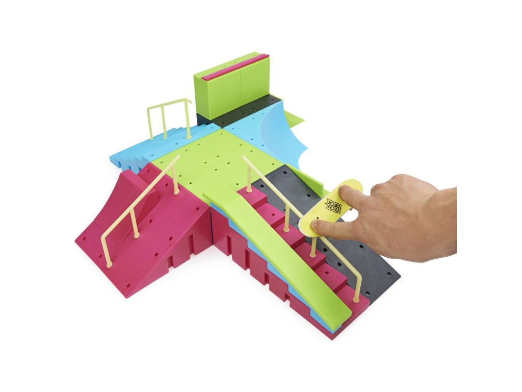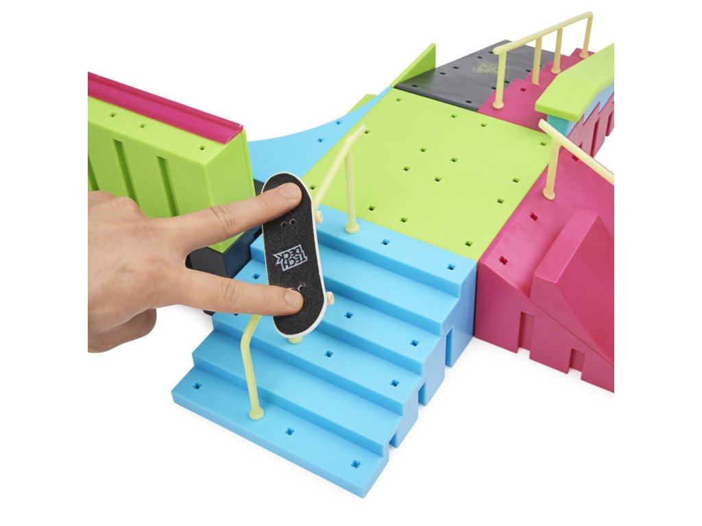 Navrhněte a postavte svůj velký neonový skatepark zářící ve tmě. Tvořte různé kombinace s několika rampami, schodišťovými sadami, zábradlími, římsami a dalšími, abyste se naučili a rozvíjeli své triky. Obsahuje 2 fingerboardy Tech Deck, 4 karty triků, 2 panely, 1 rampa, 1 bowl rampa, 1 pevná rampa, 2 nájezdové rampy, 1 zábradlí, 2 krátká zábradlí, 1 čtvercový panel, 2 schodiště, 1 box, 1 malý box, 1schodišťový sjezd, 1 dlouhá rampa, 4 malé podpěry, 4 nosníky, 1 Coping, 26 X-konektorů, 6 velkých X-konektorů, 26 nožek, návod. Vhodné od 6 let.